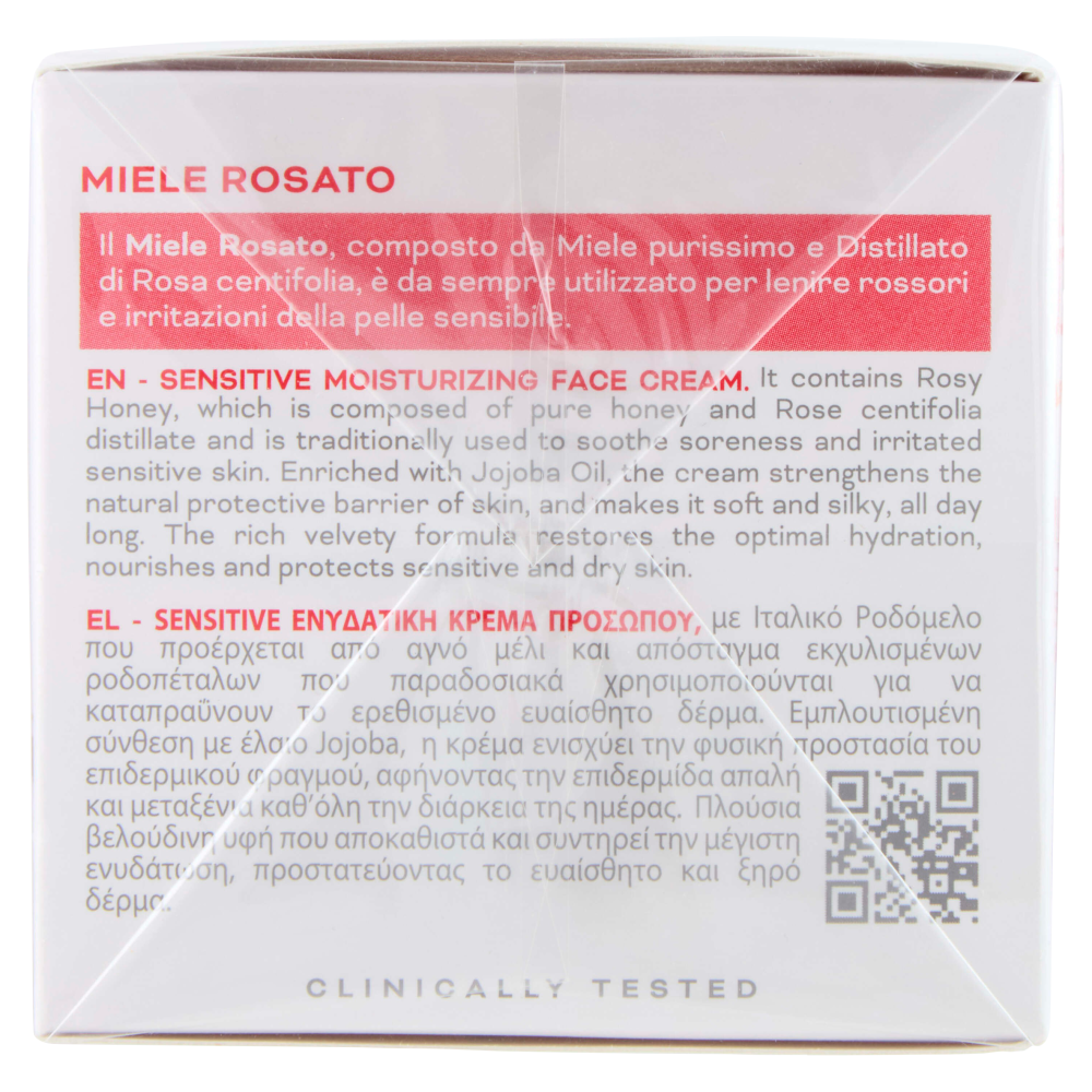 Miele Rosato Il Miele Rosato, composto de Miele purissimo e Distillato di Rosa centifolia, è da sempre utilizzato per lenire rossori e irritazioni della pelle sensibile. Crema idratante sensitive La Ricetta ultra-comfort al Miele rosato nutre e protegge le pelli secche e sensibili. Azione Ricca e vellutata, ripristina l'idratazione ottimale e allevia la sensazione di secchezza, assicurando alla pelle prolungato comfort. Arricchita con Olio di Jojoba, rinforza la barriera protettiva della pelle e la rende morbida e setosa per tutto il giorno. Clinicamente testata Senza siliconi e petrolati