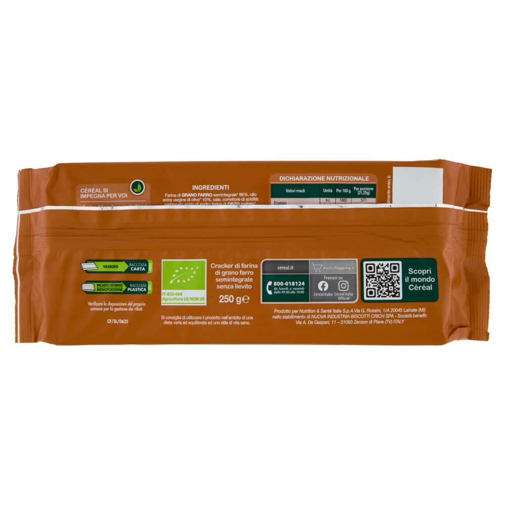 Céréal si impegna per voi I Cracker di Farro Senza Lievito Céréal sono prodotti con la massima cura: - senza lievito - con olio extra vergine di oliva - con farina di grano farro semintegrale Si consiglia di utilizzare il prodotto nell'ambito di una dieta varia ed equilibrata ed uno stile di vita sano.