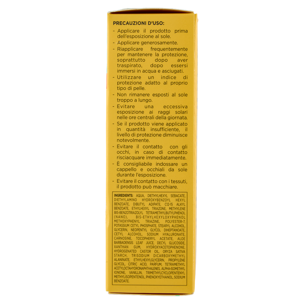 Precauzioni d'uso: - Applicare il prodotto prima dell'esposizione al sole. - Applicare generosamente. - Riapplicare frequentemente per mantenere la protezione, soprattutto dopo aver traspirato, dopo essersi immersi in acqua e asciugati. - Utilizzare un indice di protezione adatto al proprio tipo di pelle. - Non rimanere esposti al sole troppo a lungo. - Evitare una eccessiva esposizione ai raggi solari nelle ore centrali della giornata. - Se il prodotto viene applicato in quantità insufficiente, il livello di protezione diminuisce notevolmente. - Evitare il contatto con gli occhi, in caso di contatto risciacquare immediatamente. - È consigliabile indossare un cappello e occhiali da sole durante l'esposizione. - Evitare il contatto con i tessuti, il prodotto può macchiare.