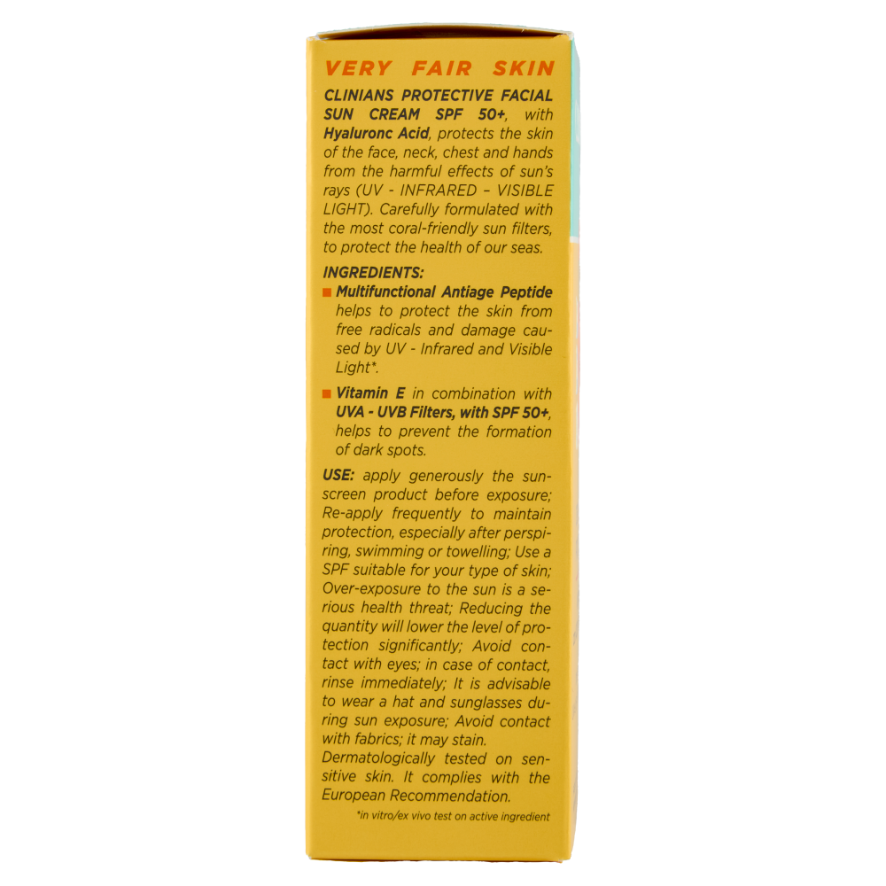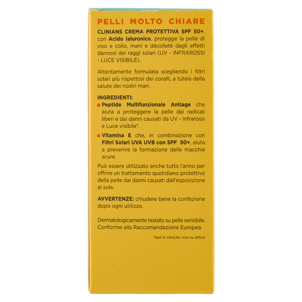 Pelli molto chiare Clinians Crema Protettiva SPF 50+, con Acido Ialuronico, protegge la pelle di viso e collo, mani e décolleté dagli effetti dannosi dei raggi solari (UV - Infrarossi - Luce visibile). Attentamente formulata scegliendo i filtri solari più rispettosi dei coralli, a tutela della salute dei nostri mari. Ingredienti: - Peptide Multifunzionale Antiage che aiuta a proteggere la pelle dai radicali liberi e dai danni causati da UV - Infrarossi e Luce visibile*. - Vitamina E che, in combinazione con Filtri Solari UVA UVB con SPF 50+, aiuta a prevenire la formazione delle macchie scure. Può essere utilizzato anche tutto l'anno per offrire un trattamento quotidiano protettivo della pelle dai danni causati dall'esposizione al sole. *test in vitro/ex vivo su attivo Dermatologicamente testato su pelle sensibile. Conforme alla Raccomandazione Europea.