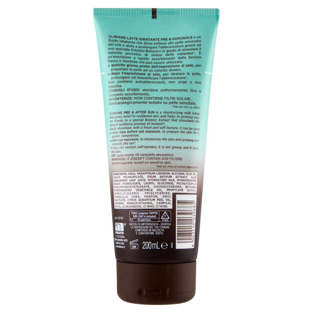 Clinians Latte Idratante Pre & Doposole è un fluido idratante che dona sollievo alla pelle arrossata dal sole e aiuta a prolungare l'abbronzatura grazie ad uno speciale Estratto Botanico in grado di stimolare il naturale processo di sintesi della melanina*. È un'emulsione a rapido assorbimento dalla texture fresca e morbida che può essere utilizzata: - qualche giorno prima dell'esposizione al sole, per preparare la pelle ad un colorito dorato. - dopo l'esposizione al sole, per idratare la pelle, prolungare ed intensificare l'abbronzatura*. Non contiene autoabbronzanti, non unge e non macchia. *test ex vivo su attivo Dermatologicamente testato su pelle sensibile.