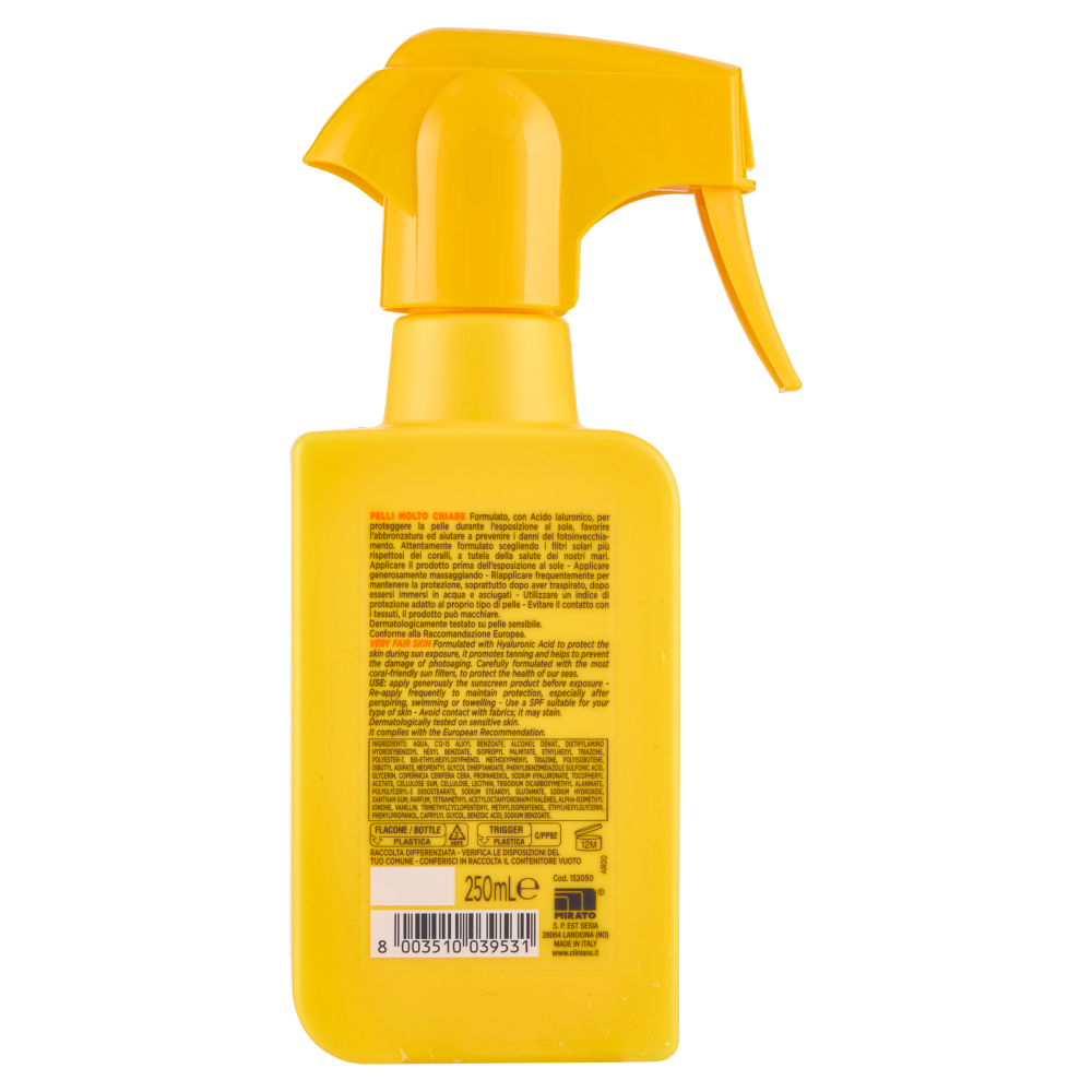 Pelli Molto Chiare Formulato, con Acido Ialuronico, per proteggere la pelle durante l'esposizione al sole, favorire l'abbronzatura ed aiutare a prevenire i danni del fotoinvecchiamento. Attentamente formulato scegliendo i filtri solari più rispettosi dei coralli, a tutela della salute dei nostri mari. Dermatologicamente testato su pelle sensibile. Conforme alla Raccomandazione Europea.