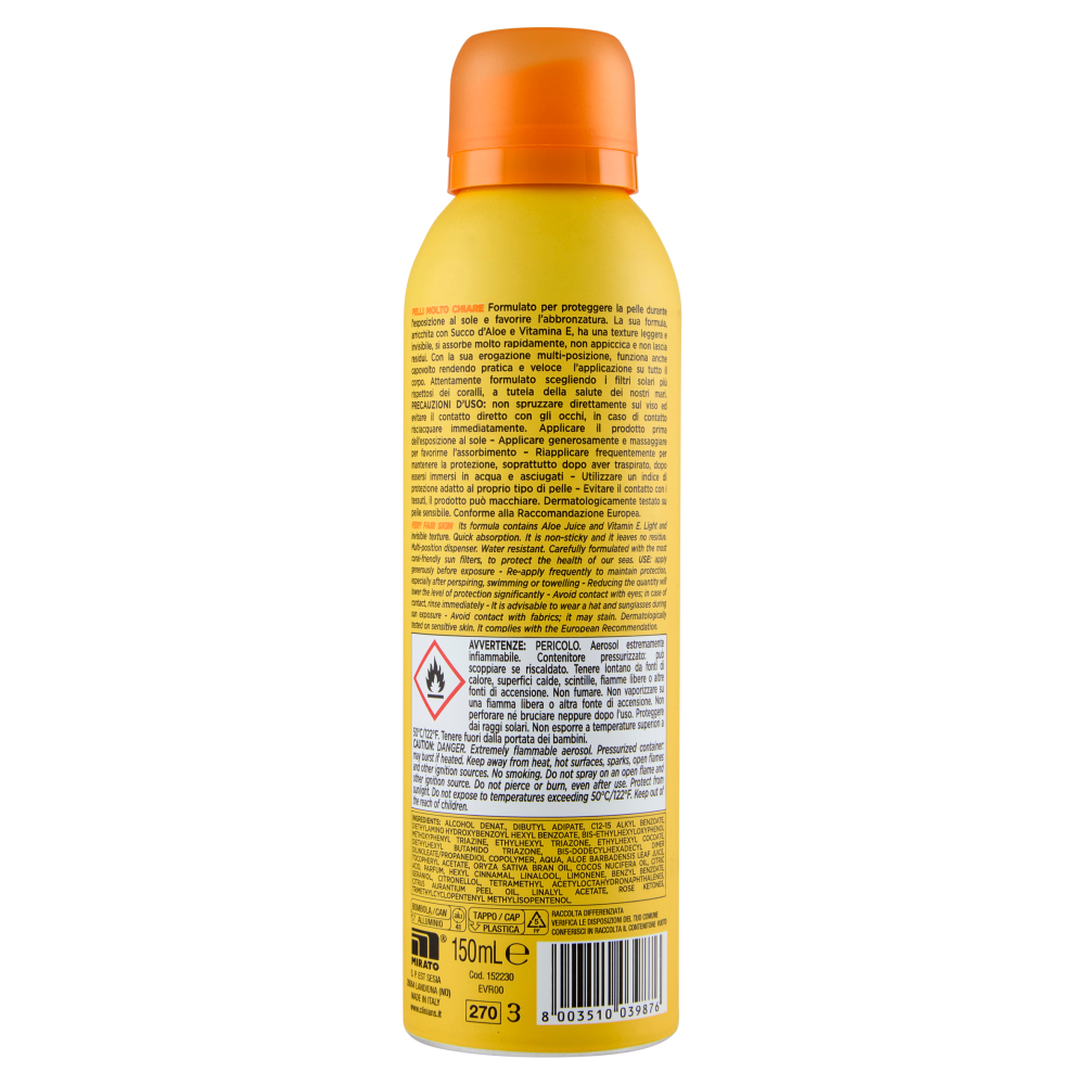 Pelli Molto Chiare Formulato per proteggere la pelle durante l'esposizione al sole e favorire l'abbronzatura. La sua formula, arricchita con Succo d'Aloe e Vitamina E, ha una texture leggera e invisibile, si assorbe molto rapidamente, non appiccica e non lascia residui. Con la sua erogazione multi-posizione, funziona anche capovolto rendendo pratica e veloce l'applicazione su tutto il corpo. Attentamente formulato scegliendo i filtri solari più rispettosi dei coralli, a tutela della salute dei nostri mari. Dermatologicamente testato su pelle sensibile. Conforme alla Raccomandazione Europea.