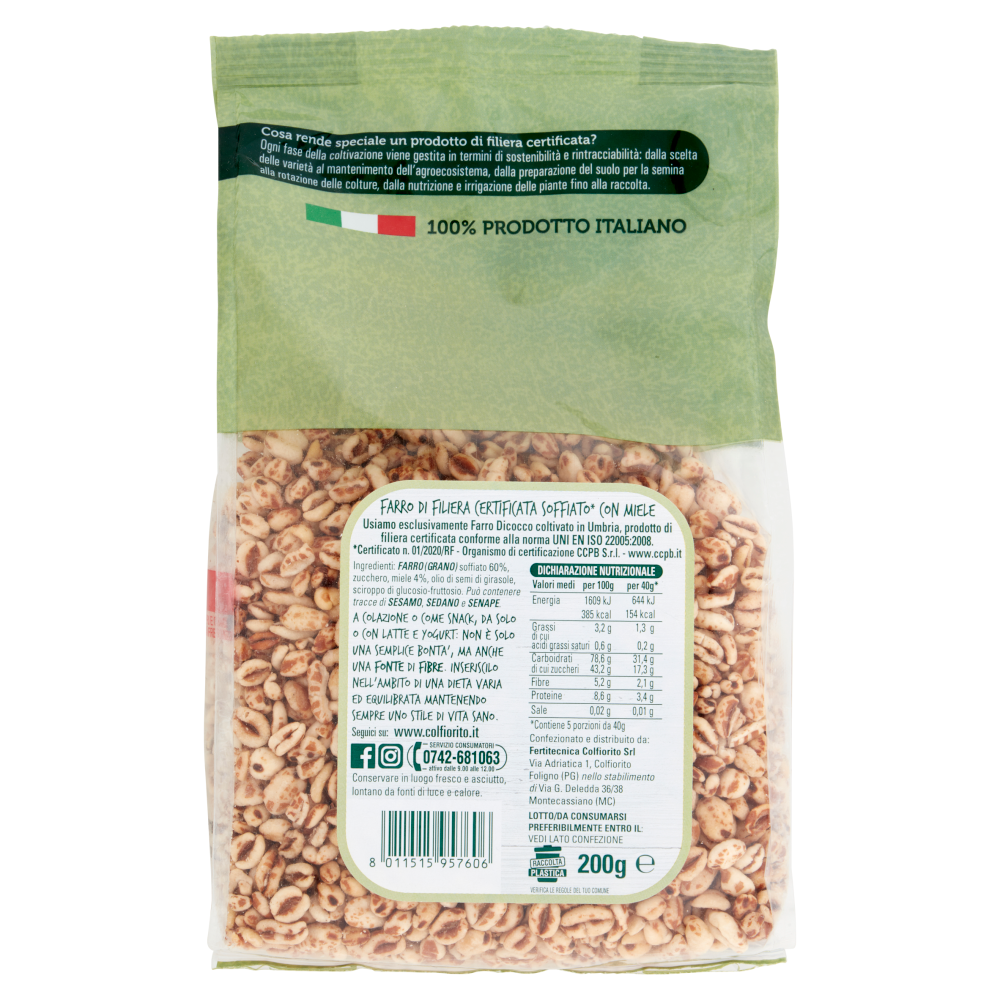 Farro di filiera certificata soffiato* con miele *Certificato n. 01/2020/RF - Organismo di certificazione CCPB S.r.l. - www-ccpb.it