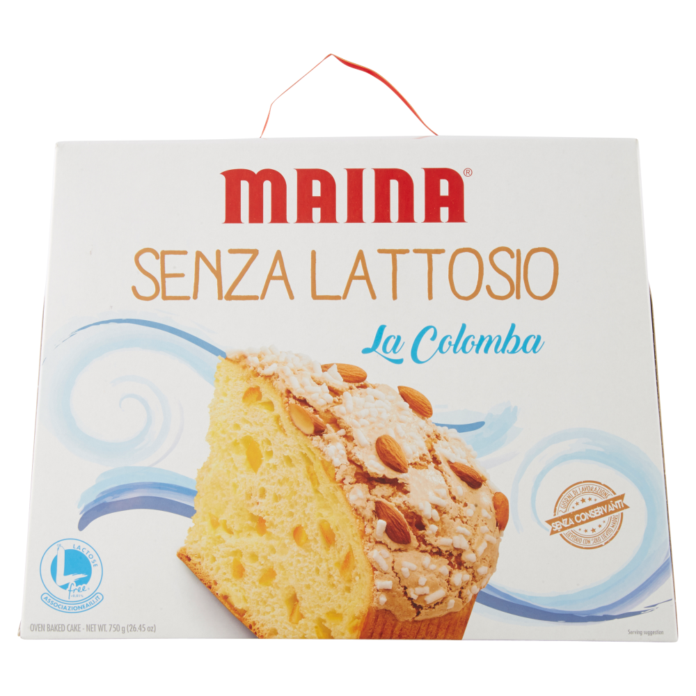 Senza lattosio Maina. 3 Segreti per gustarla nella sua forma migliore. 1. Servire la Colomba a temperatura ambiente. 18 ÷ 20 °C 2. Prima di affettare, togliere il pirottino di carta. 3. Tagliare le fette delicatamente, utilizzando il classico coltello da pane a lama seghettata, senza esercitare pressione.