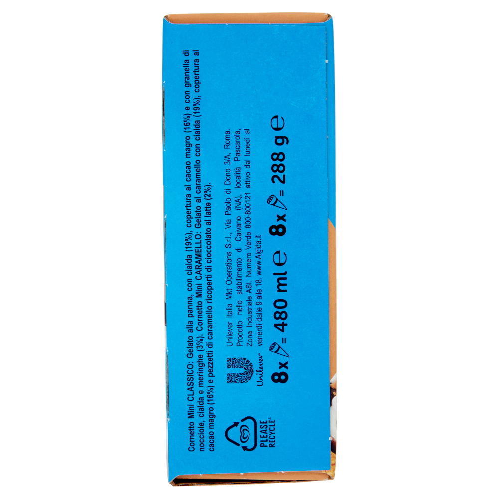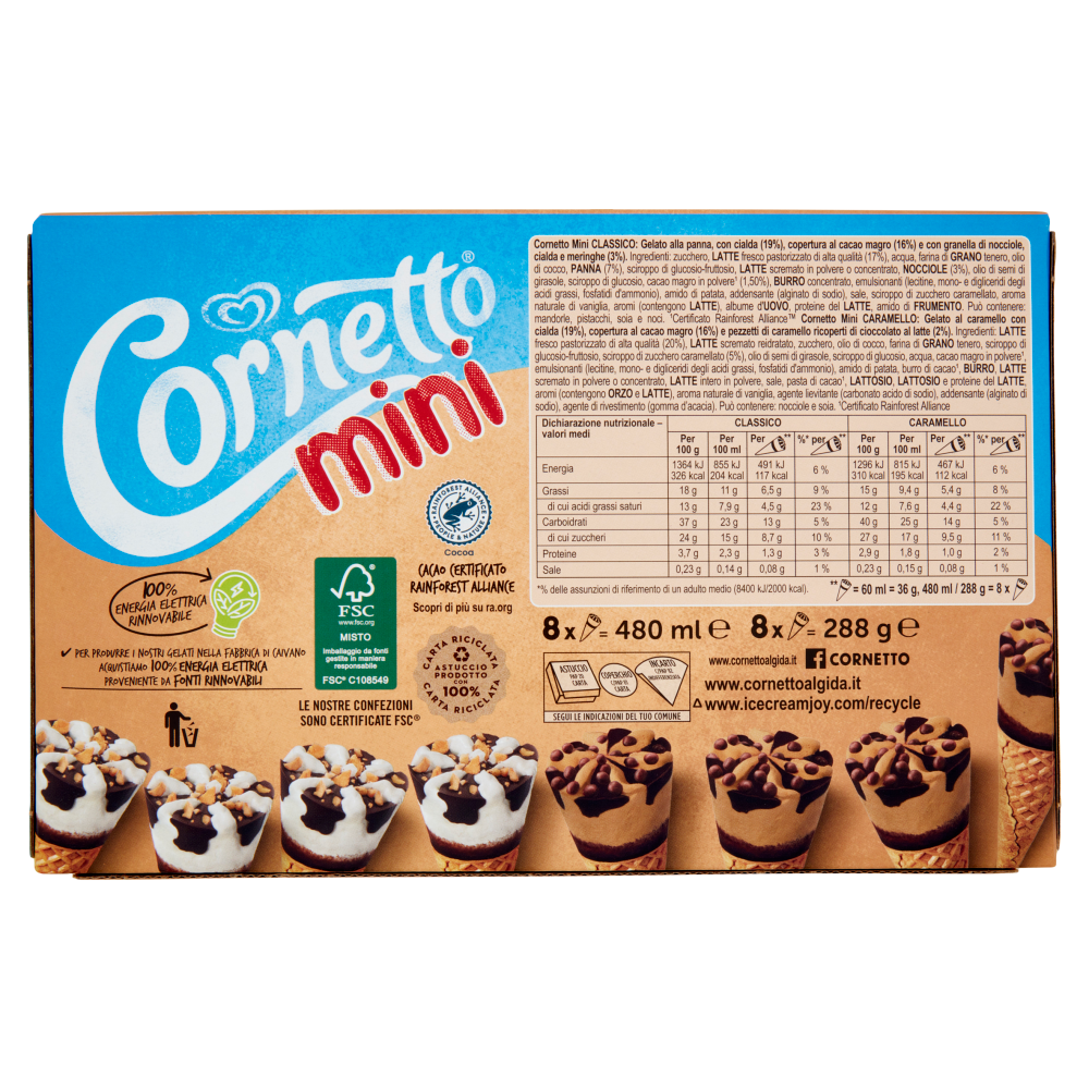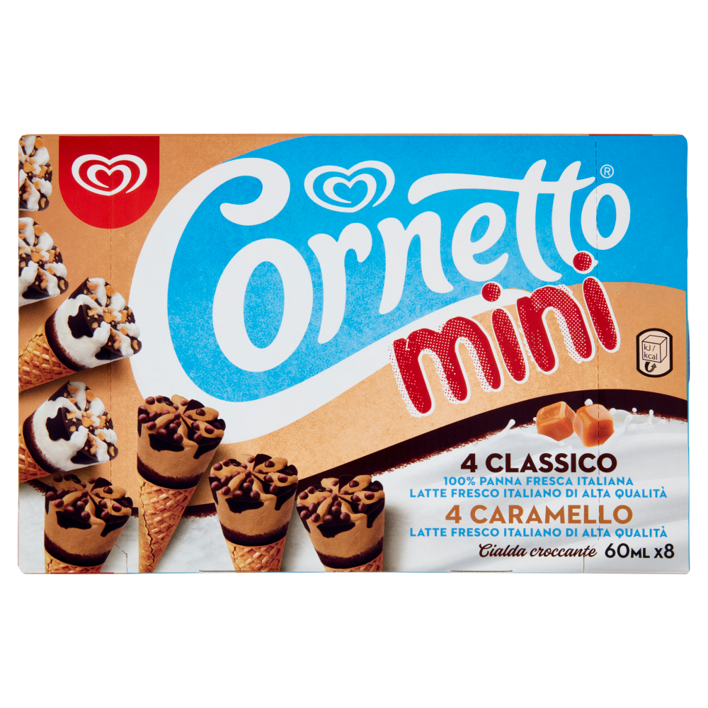 Cornetto Mini classico: Gelato alla panna, con cialda (19%), copertura al cacao magro (16%) e con granella di nocciole, cialda e meringhe (3,5%) Cornetto Mini caramello: Gelato al caramello con cialda (19%), copertura al cacao magro (16%) e pezzetti di caramello ricoperti di cioccolato al latte (2%)