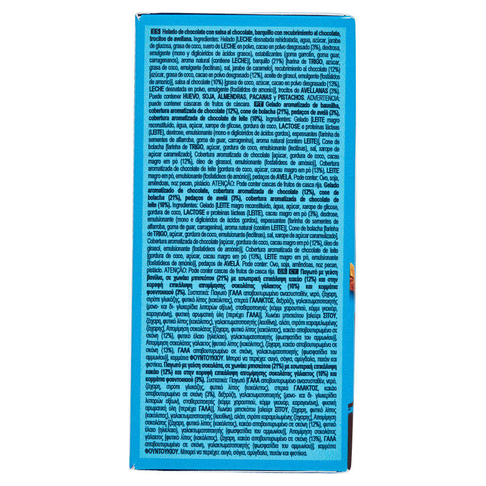 Gelato alla vaniglia, con cialda (21%) rivestita al cacao magro (12%), copertura al cacao magro (10%) e granella di nocciole (3%). Gelato al cacao magro con cialda (21%) rivestita al cacao magro (12%), copertura al cacao magro (10%) e granella di nocciole (3%)