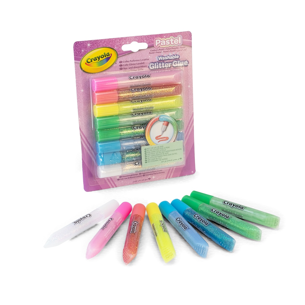 Assortimento di otto colle glitter dai delicati colori pastello. Ideali per decorare su carta e cartoncino, per incollare o dare un tocco scintillante ai propri capolavori. Le colle si lavano facilmente dalla pelle e dai tessuti per decorare in tutta sicurezza.