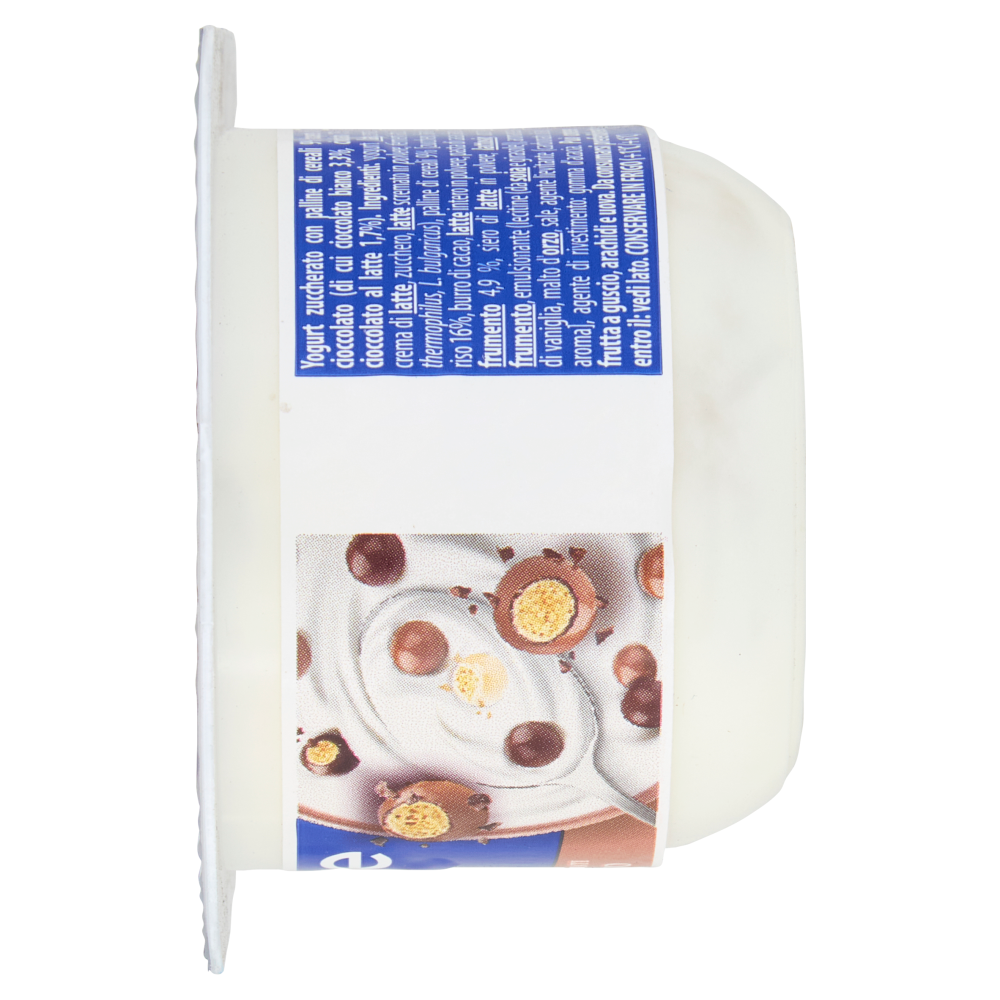 Yogurt zuccherato con palline di cereali 9% ricoperte di cioccolato (di cui cioccolato bianco 3,3%, cioccolato 1,7%, cioccolato al latte 1,7%)