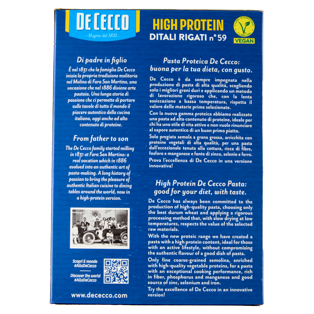 De Cecco - Mugnai dal 1831 - Pasta Proteica De Cecco: buona per la tua dieta, con gusto. De Cecco è da sempre impegnata nella produzione di pasta di alta qualità, scegliendo solo i migliori grani duri e applicando un metodo di lavorazione rigoroso che, con la lenta essiccazione a bassa temperatura, rispetta il valore delle materie prime selezionate. Con la nuova gamma proteica abbiamo realizzato una pasta ad alto contenuto di proteine, ideale per chi ha uno stile di vita attivo e non vuole rinunciare al sapore autentico di un buon primo piatto. Solo pregiata semola a grana grossa, arricchita con proteine vegetali di alta qualità, per una pasta dall'eccezionale tenuta alla cottura, ricca di fibre, fosforo e manganese e fonte di zinco, selenio e ferro. Prova l'eccellenza di De Cecco in una versione innovativa! Di padre in figlio È nel 1831 che la famiglia De Cecco inizia la propria tradizione molitoria nel Molino di Fara San Martino, una vocazione che nel 1886 diviene arte pastaia. Una lunga storia di passione che ci permette di portare sulle tavole di tutto il mondo il piacere autentico della cucina italiana, oggi anche ad alto contenuto di proteine. Scopri il mondo #AllaDeCecco