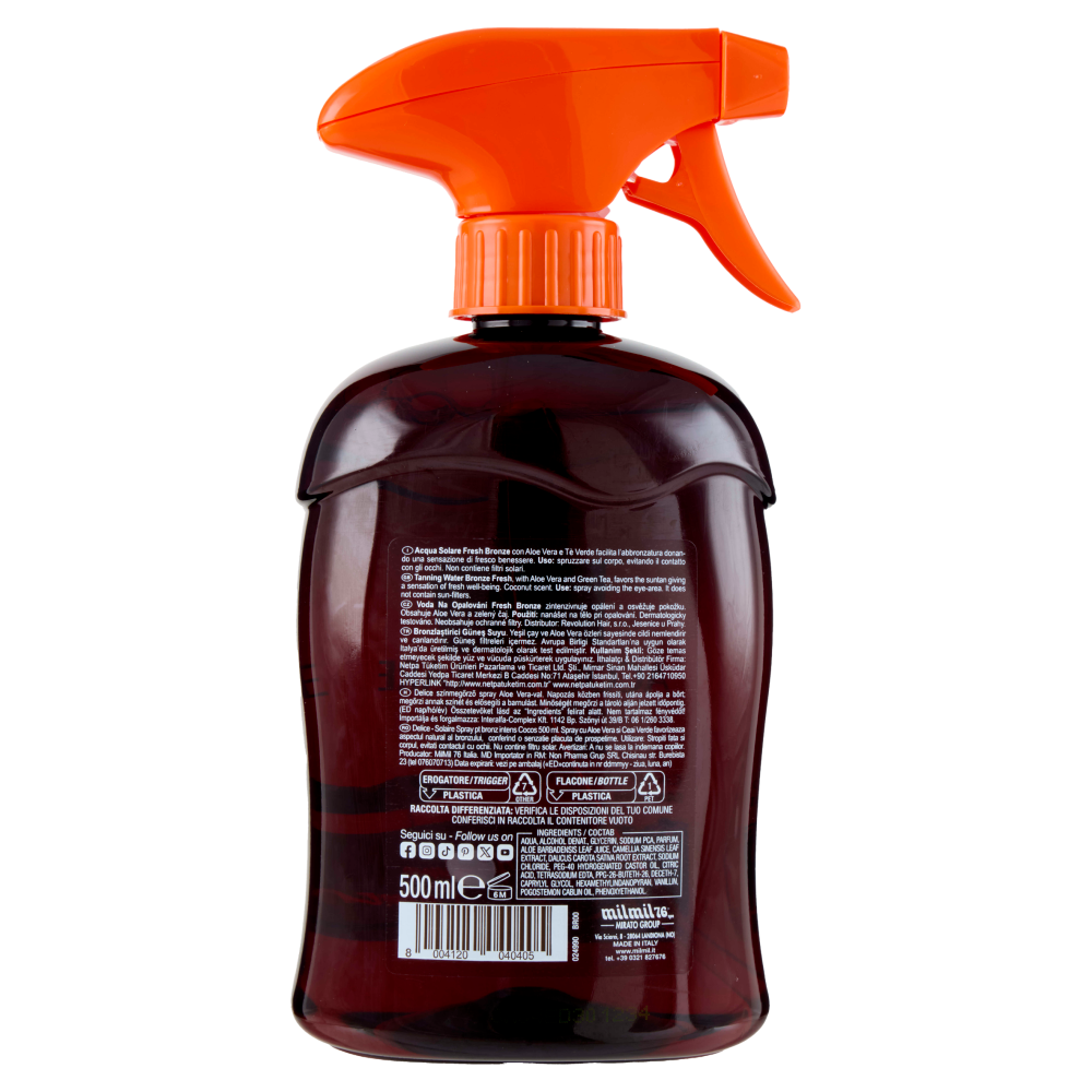 Acqua Bronze Fresh con Aloe Vera e Tè Verde facilita l'abbronzatura donando una sensazione di fresco benessere.