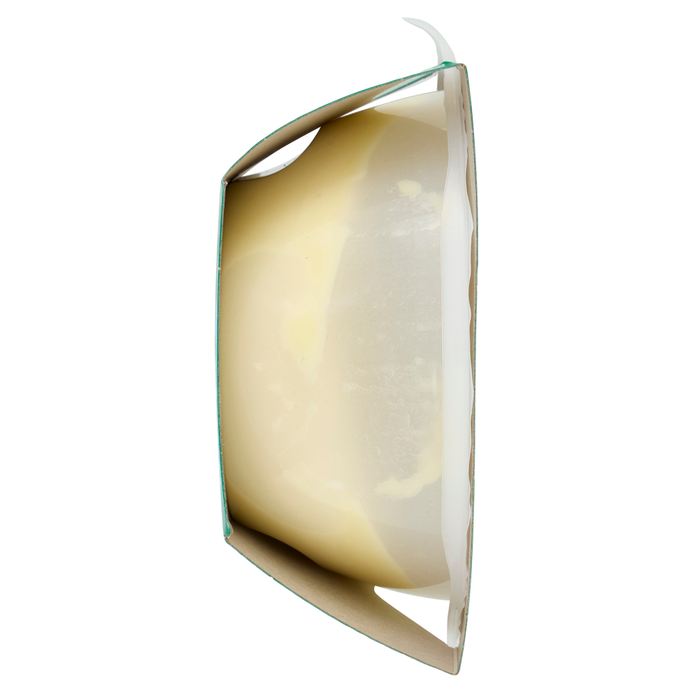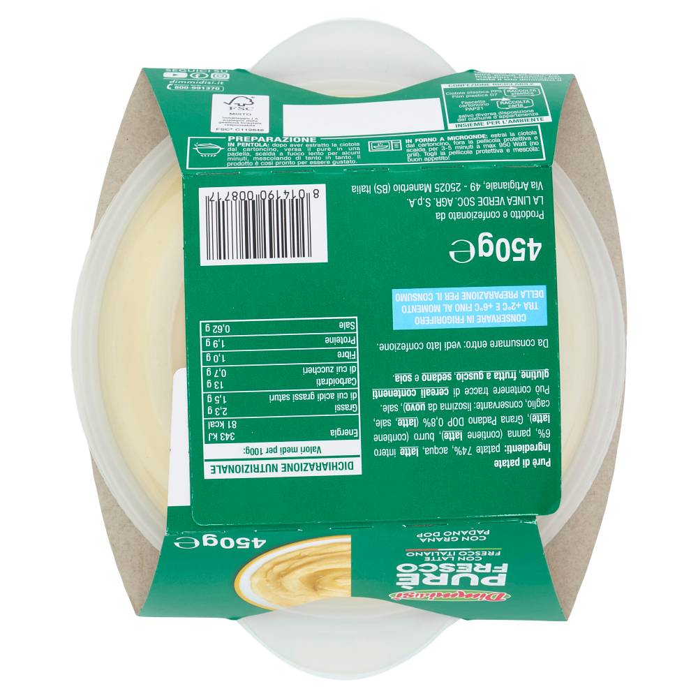 Preparazione In pentola: dopo aver estratto la ciotola dal cartoncino, versa il purè in una padella, scalda a fuoco lento per alcuni minuti, mescolando di tanto in tanto. II prodotto è così pronto per essere gustato. In forno a microonde: estrai la ciotola dal cartoncino, fora la pellicola protettiva e scalda per 3-5 minuti a max 950 Watt (no grill). Togli la pellicola protettiva e mescola: buon appetito!