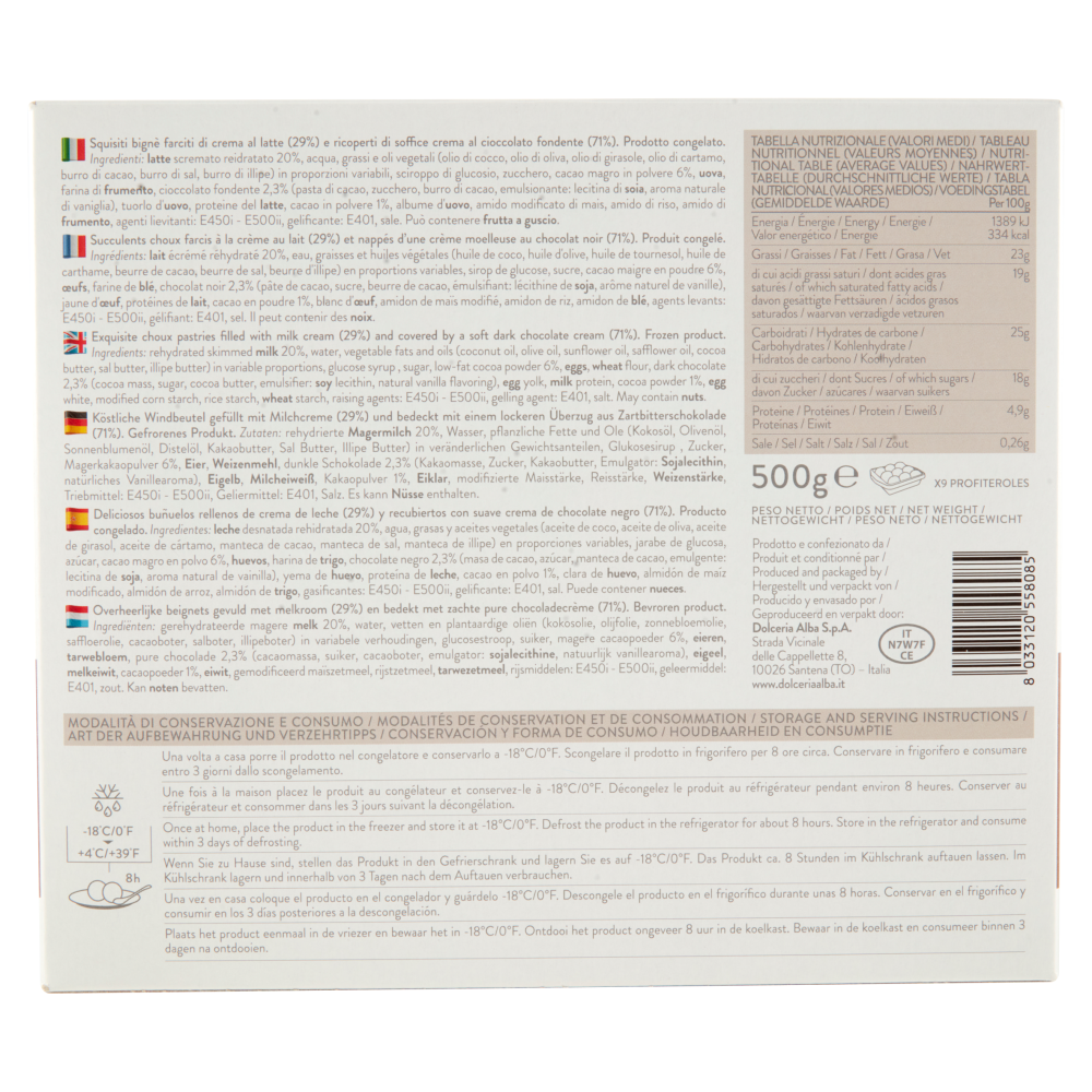 Squisiti bignè farciti di crema al latte (29%) e ricoperti di soffice crema al cioccolato fondente (71%). Prodotto congelato