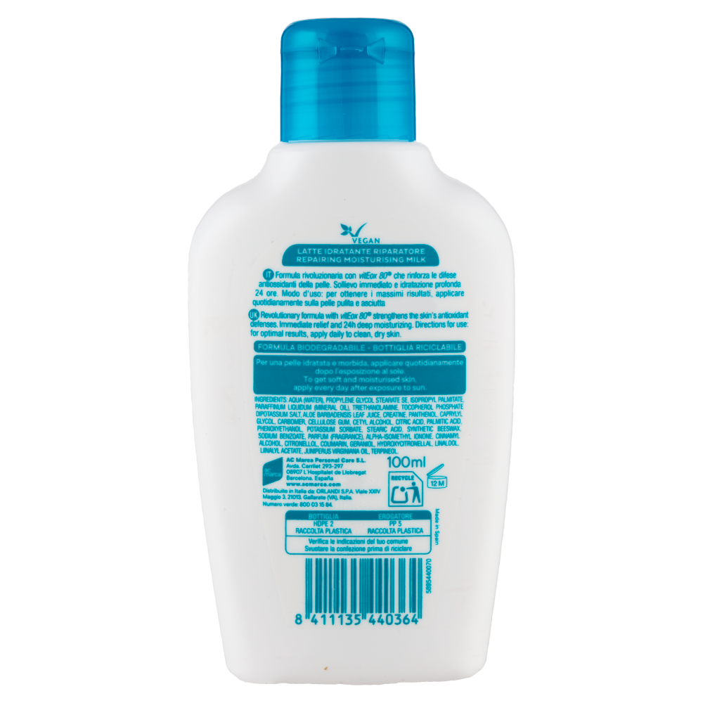Vegan Formula rivoluzionaria con vitEox 80 che rinforza le difese antiossidanti della pelle. Sollievo immediato e idratazione profonda 24 ore. Formula biodegradabile - Bottiglia riciclabile Per una pelle idratata e morbida, applicare quotidianamente dopo l'esposizione al sole.