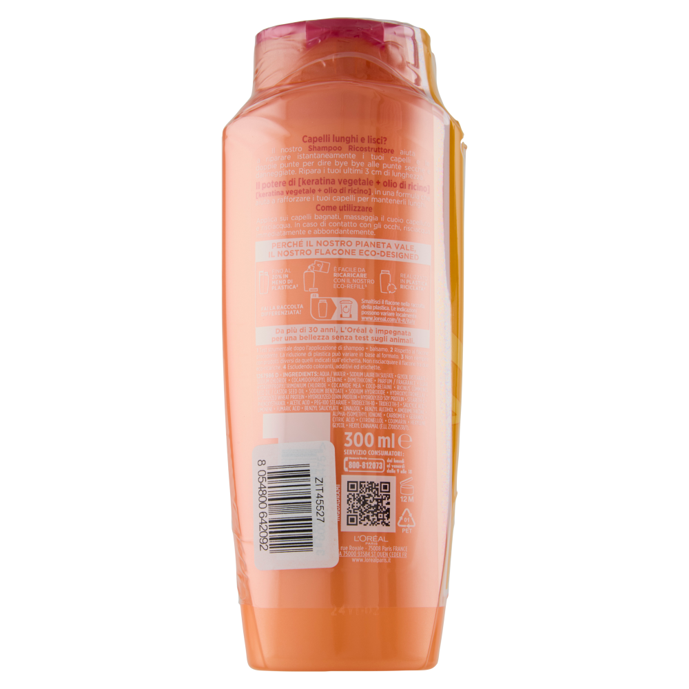 Capelli lunghi e lisci? Il nostro Shampoo Ricostruttore aiuta a riparare istantaneamente i tuoi capelli e le doppie punte per dire bye bye alle punte secche e danneggiate. Ripara i tuoi ultimi 3 cm di lunghezza¹. ¹ Test strumentale dopo l'applicazione di shampoo + balsamo. Il potere di [keratina vegetale + olio di ricino] [keratina vegetale + olio di ricino], in una formula che aiuta a rafforzare i tuoi capelli per mantenerli lunghi.