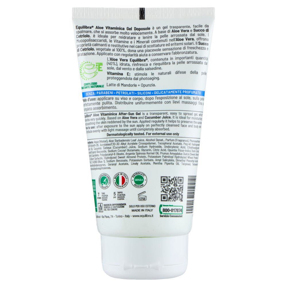 Equilibra Aloe Vitaminica Gel Doposole è un gel trasparente, facile da spalmare, che si assorbe molto velocemente. A base di Aloe Vera e Succo di Cetriolo, è ideale per reidratare e lenire la pelle arrossata dal sole. I Mucopolisaccaridi, le Vitamine e i Minerali contenuti nell'Aloe Vera, offrono proprietà calmanti e restitutive nei casi di scottature ed eritemi solari. Il Succo di Cetriolo, vegetale al 100%, dona una piacevole sensazione di freschezza e idratazione. Applicato con regolarità aiuta a conservare l'abbronzatura. L'Aloe Vera Equilibra, contenuta in importanti quantità (40%), idrata, rinfresca e riequilibra la pelle arrossata dal sole, dal vento e dalla salsedine. +Vitamina E Vitamina E: stimola le naturali difese della pelle proteggendola dal photoaging. Complesso idratante naturale Latte di Mandorle + Opunzia. Senza: parabeni - petrolati - siliconi - delicatamente profumato Dermatologicamente testato Made in Italy - Prodotto in Italia Senza: petrolati - siliconi
