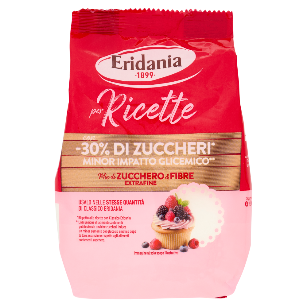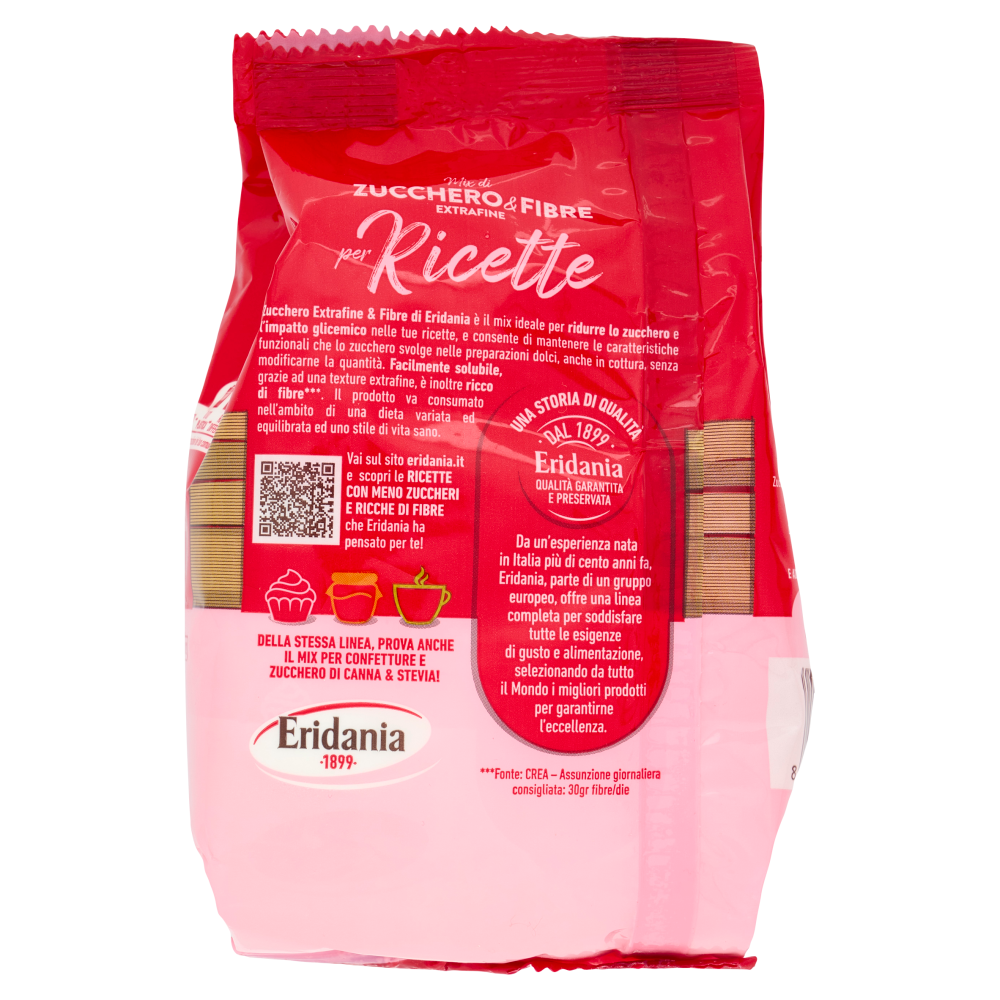 Zucchero Extrafine & Fibre di Eridania è il mix ideale per ridurre lo zucchero e l'impatto glicemico nelle tue ricette, e consente di mantenere le caratteristiche funzionali che lo zucchero svolge nelle preparazioni dolci, anche in cottura, senza modificarne la quantità. Facilmente solubile, grazie ad una texture extrafine, è inoltre ricco di fibre***. Il prodotto va consumato nell'ambito di una dieta variata ed equilibrata ed uno stile di vita sano. ***Fonte: CREA - Assunzione giornaliera consigliata: 30gr fibre/die Naturalmente privo di glutine e adatto ad un'alimentazione vegana.