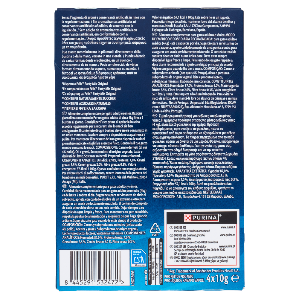 Senza l'aggiunta di aromi e conservanti artificiali, in linea con la regolamentazione. - 100% Gustoso - Gustosi snack liquidi - Basso in calorie* - Senza zuccheri aggiunti** *Rispetto a FELIX Party Mix Original **Contiene naturalmente zuccheri