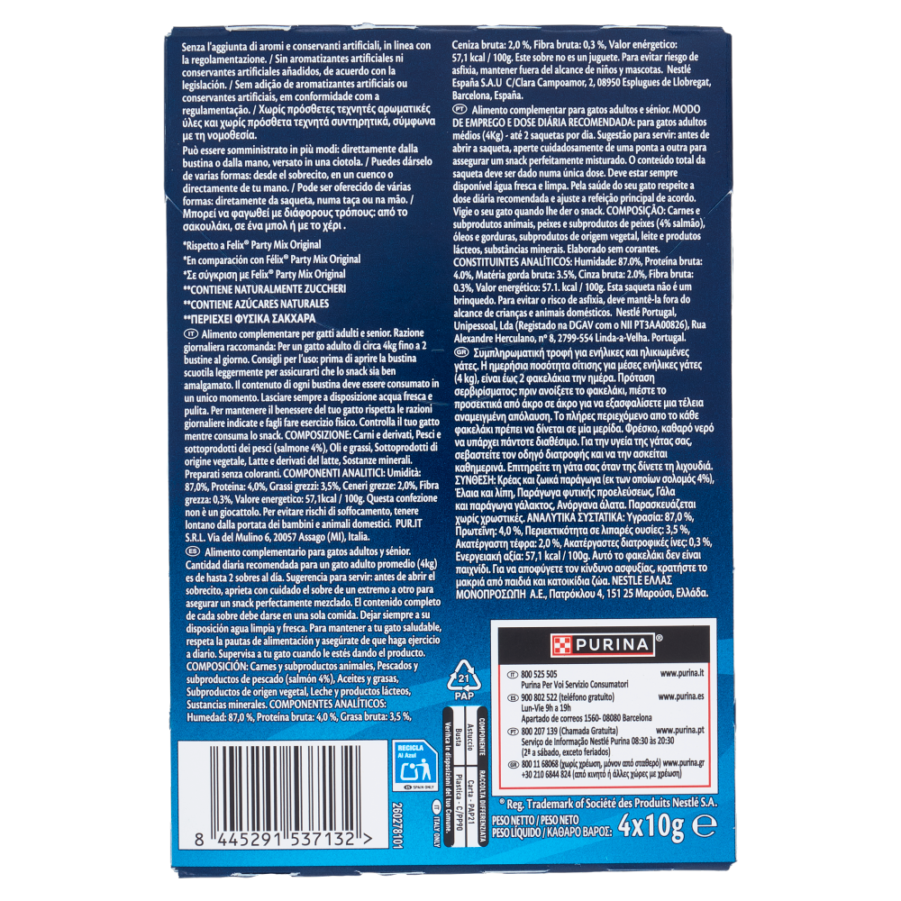 Senza l'aggiunta di aromi e conservanti artificiali, in linea con la regolamentazione. - 100% Gustoso - Gustosi snack liquidi - Basso in calorie* - Senza zuccheri aggiunti** *Rispetto a FELIX Party Mix Original **Contiene naturalmente zuccheri