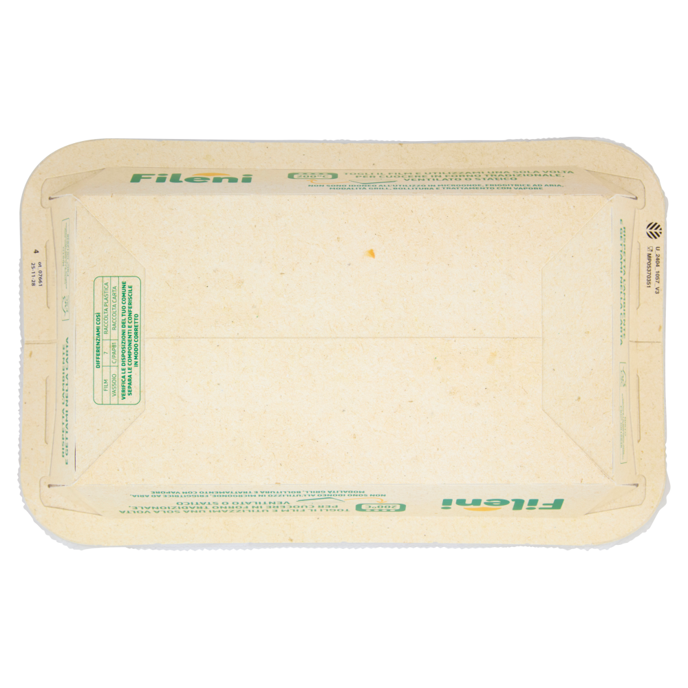200°C vassoio direttamente in forno 12 min. Togli il film e utilizzami una sola volta per cuocere in forno tradizionale, ventilato o statico Non sono idoneo all'utilizzo in microonde, friggitrice ad aria, modalità grill, bollitura e trattamento con vapore