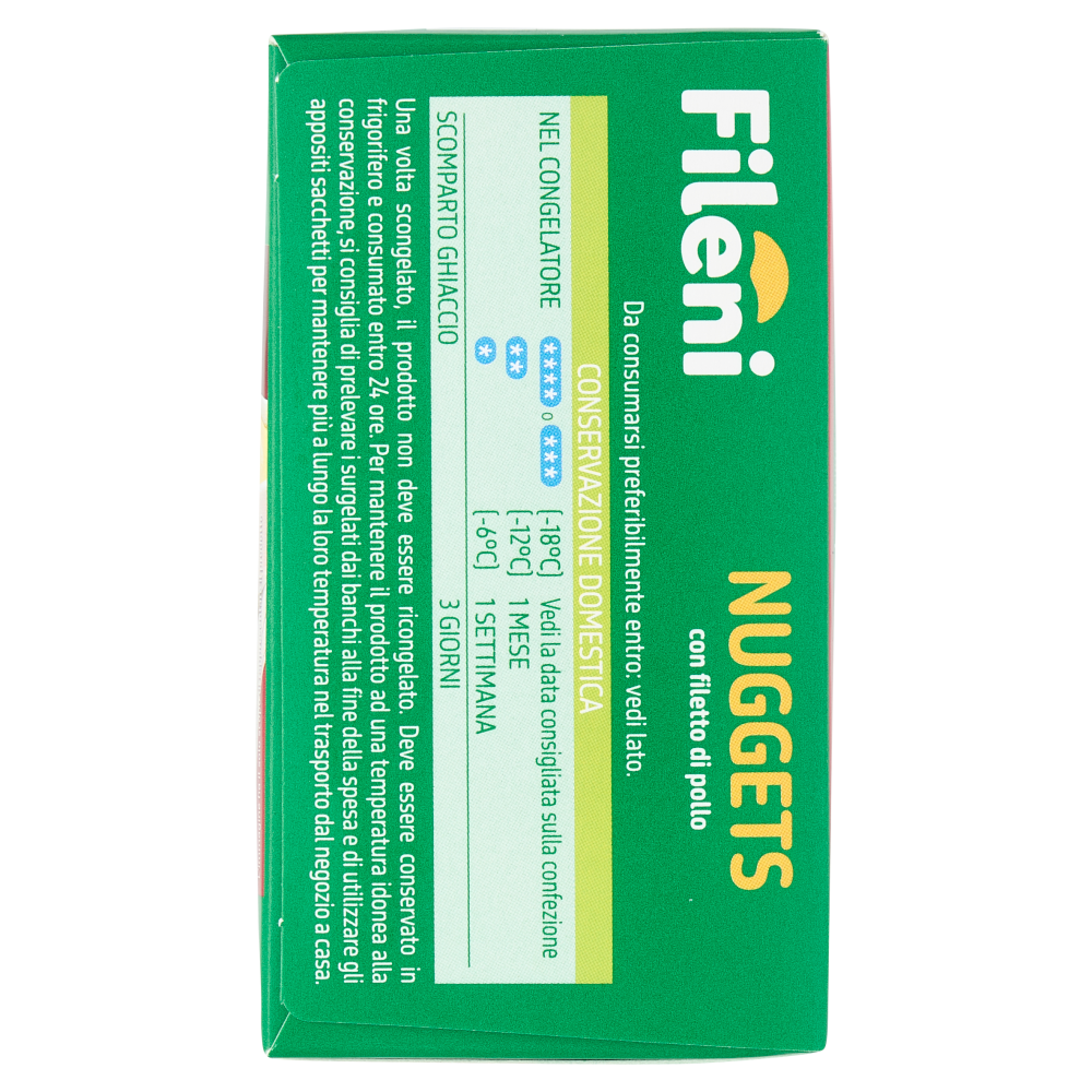 Prodotto surgelato Da consumarsi previa cottura, seguendo le modalità di preparazione sotto riportate: - In friggitrice ad aria: disporre i nuggets ancora surgelati nel cestello. Impostare la friggitrice ad aria a 200 °C e cuocere per 10 minuti. - In padella: mettere i nuggets ancora surgelati in una padella antiaderente con un filo d'olio già caldo e cuocere a fuoco medio per 13 minuti, girando di tanto in tanto. - In forno: preriscaldare il forno ventilato a 220 °C. Disporre i nuggets ancora surgelati su una teglia, con sopra della carta da forno, e cuocere per 12 minuti. Girare a metà cottura.