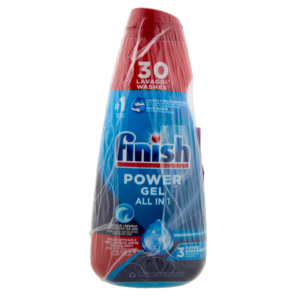 Finish Power Gel, per una pulizia efficace e brillantezza. La sua formula a rapido scioglimento con 3 poteri sgrassanti*, rimuove lo sporco difficile e scioglie i residui incrostati da 24h. È efficace anche nei cicli brevi. *Tensioattivi, coadiuvanti del lavaggio e composti alcalini.