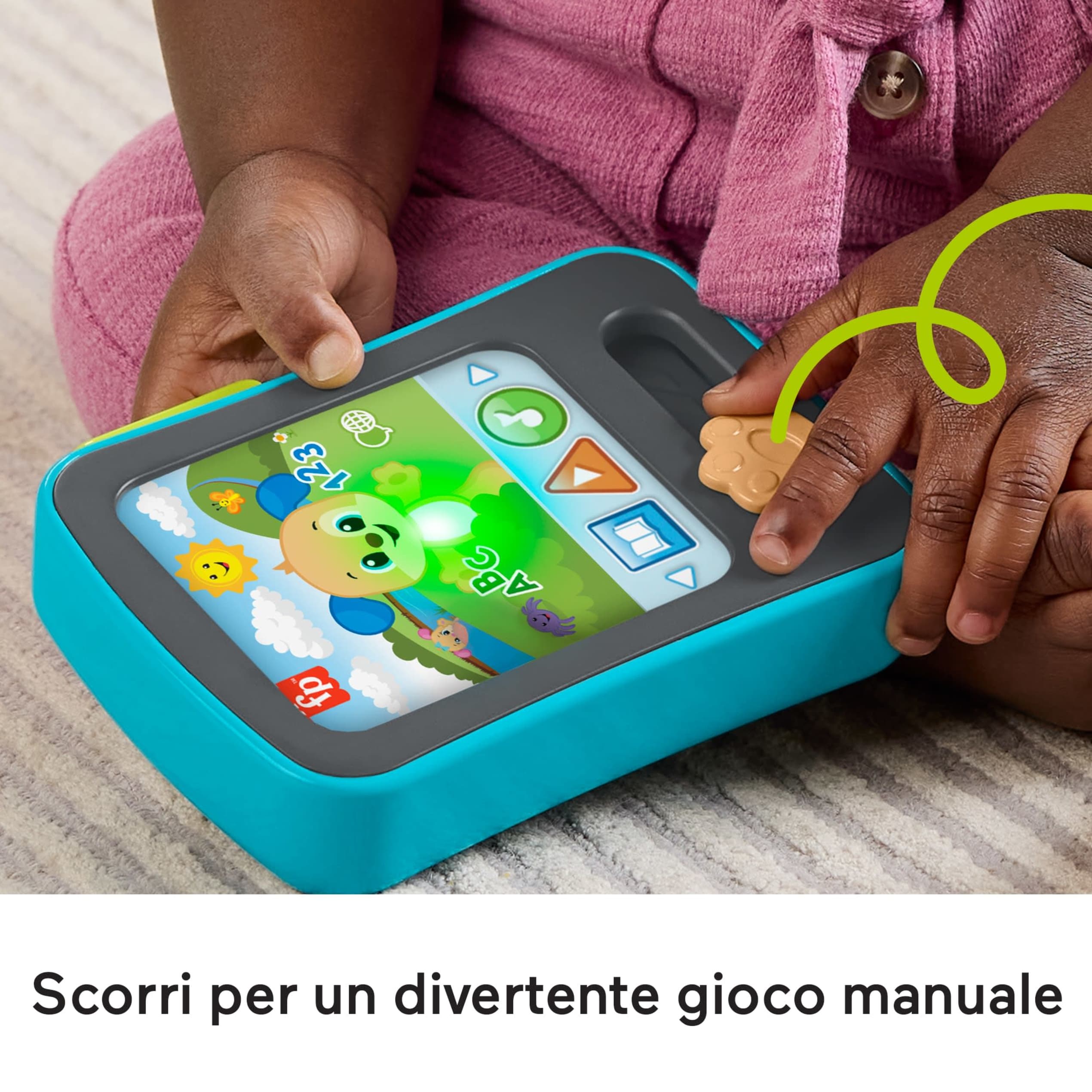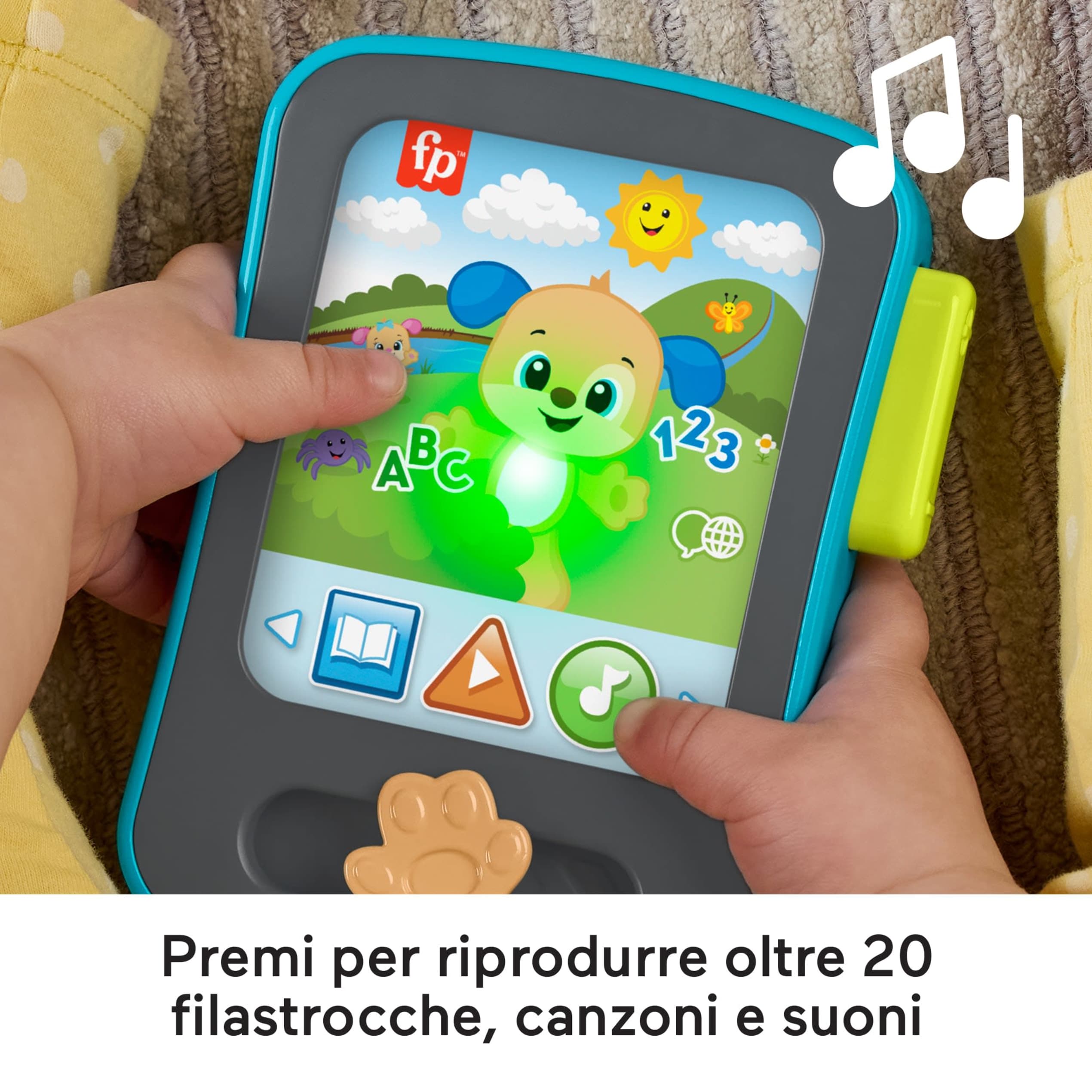 Il bambino può coccolarsi con le sue storie preferite con questo giocattolo per l'apprendimento di finto e-Reader di Fisher-Price. Proprio simile alla versione degli adulti, il Tablet delle Storie di Cagnolino Ridi e Impara dispone di 3 pulsanti che i più piccoli possono premere per attivare luci, canzoni e suoni, oltre a divertenti attività da esplorare. Con oltre 20 filastrocche, canzoni e suoni, tra cui classiche filastrocche, il Tablet delle Storie di Cagnolino sarà sicuramente la prossima 'lettura' preferita del tuo bambino! Usa il pulsante a forma di globo per selezionare la lingua: inglese, italiano, portoghese o spagnolo castigliano. Colori e decorazioni possono variare.