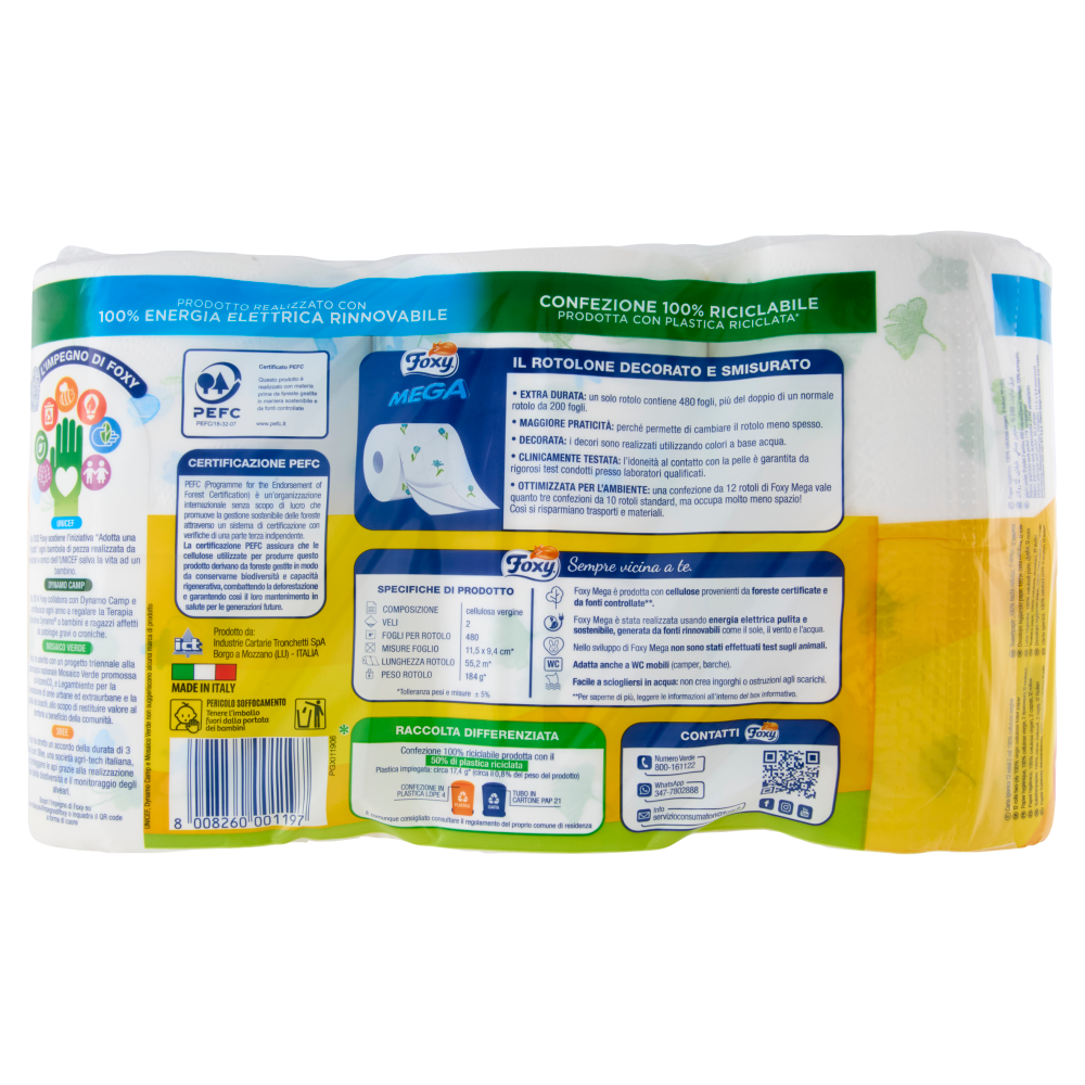 L'impegno di Foxy Unicef Dal 2002 Foxy sostiene l'iniziativa "Adotta una Pigotta": ogni bambola di pezza realizzata da volontari e amici dell'Unicef salva la vita ad un bambino. Dynamo Camp Dal 2014 Foxy collabora con Dynamo Camp e contribuisce ogni anno a regalare la Terapia Ricreativa Dynamo a bambini e ragazzi affetti da patologie gravi o croniche. Mosaico verde Foxy ha aderito con un progetto triennale alla campagna nazionale Mosaico Verde promossa da AzzeroCO₂, e Legambiente per la forestazione di aree urbane ed extraurbane e la tutela dei boschi, allo scopo di restituire valore al territorio a beneficio della comunità. 3BEE Foxy ha stretto un accordo della durata di 3 anni con 3Bee, una società agri-tech italiana, per proteggere le api grazie alla realizzazione di oasi della biodiversità e il monitoraggio degli alveari. Scopri l'impegno di Foxy su www.foxy.eu/limpegnodifoxy o inquadra il QR code a forma di cuore Foxy Sempre vicina a te. Foxy Mega è prodotta con cellulose provenienti da foreste certificate e da fonti controllate**. Foxy Mega è stata realizzata usando energia elettrica pulita e sostenibile, generata da fonti rinnovabili come il sole, il vento e l'acqua. Nello sviluppo di Foxy Mega non sono stati effettuati test sugli animali. Adatta anche a WC mobili (camper, barche). Facile a sciogliersi in acqua: non crea ingorghi o ostruzioni agli scarichi. **Per saperne di più, leggere le informazioni all'interno del box informativo. L'uso di plastica riciclata riduce i consumi di plastica vergine e stimola la filiera del recupero, dando nuovo valore al materiale da riciclare L'intero processo produttivo di Foxy Mega, dalla produzione della carta alla sua trasformazione, è realizzato con l'utilizzo del 100% di energia elettrica rinnovabile
