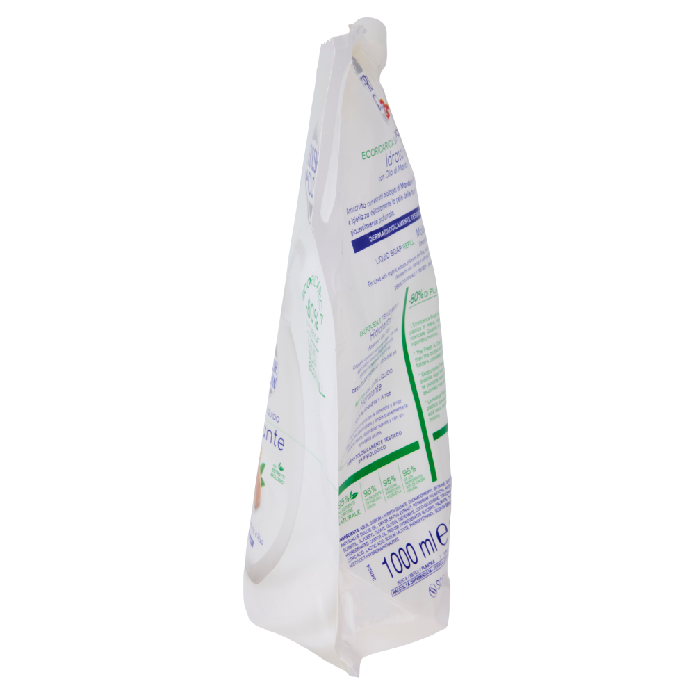 Ecoricarica Sapone Liquido Idratante con Olio di Mandorla e Riso Arricchito con estratti biologici di Mandorla e Riso, questo sapone idrata e igienizza delicatamente la pelle delle tue mani, lasciandola morbida e piacevolmente profumata. Dermatologicamente testato - pH fisiologico 95% Ingredienti di origine naturale -80% di plastica* * L'Ecoricarica Fresh & Clean da 1000 ml utilizza oltre l'80% di plastica in meno, rispetto ai flaconi con dispenser che va a ricaricare. Quando è vuota si appiattisce totalmente, con un ingombro minimo. Vegan Senza ingredienti di origine animale.