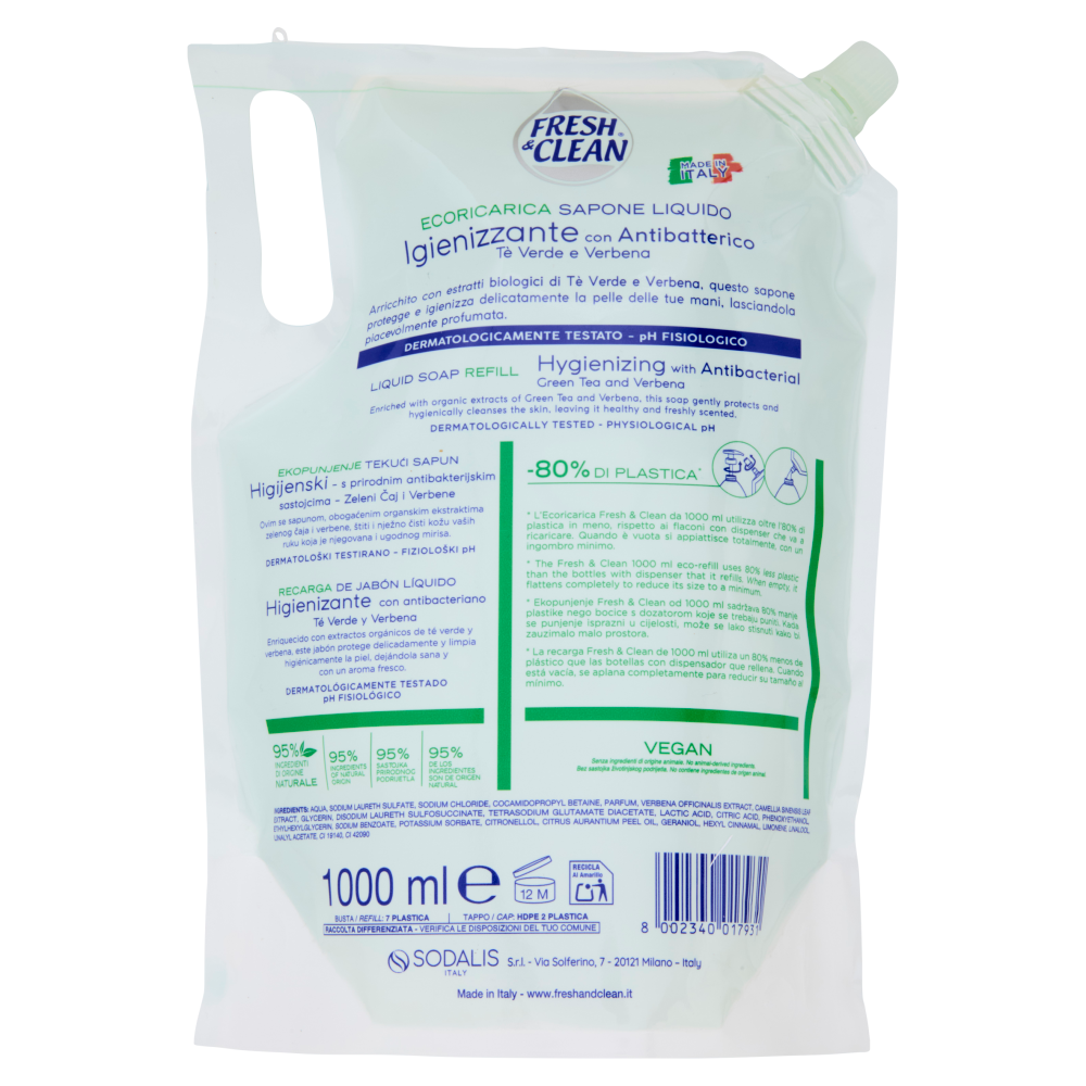 Fresh & Clean Sapone Liquido Igienizzante con Antibatterico Tè Verde e Verbena Ecoricarica 1000 ml
