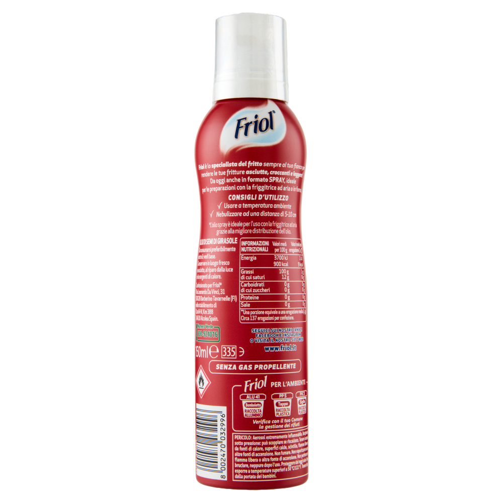 Friol è lo specialista del fritto sempre al tuo fianco per rendere le tue fritture asciutte, croccanti e leggere! Da oggi anche in formato Spray, ideale per le preparazioni con la friggitrice ad aria o in forno. Senza gas propellente