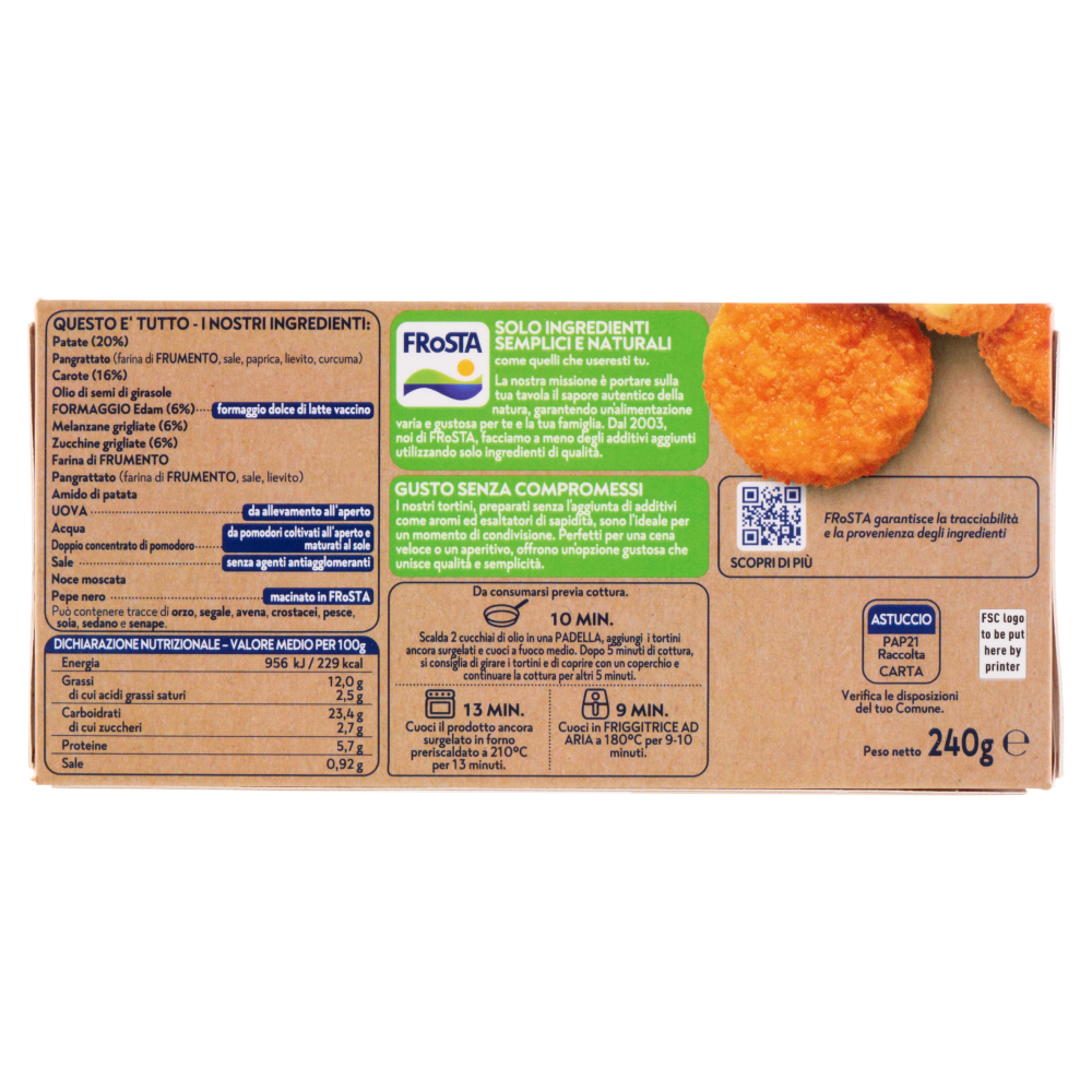 Questo e' tutto - I nostri ingredienti: Patate (20%) Pangrattato (farina di Frumento, sale, paprica, lievito, curcuma) Carote (16%) Olio di semi di girasole Formaggio Edam (6%) - formaggio dolce di latte vaccino Melanzane grigliate (6%) Zucchine grigliate (6%) Farina di Frumento Pangrattato (farina di Frumento, sale, lievito) Amido di patata Uova - da allevamento all'aperto Acqua Doppio concentrato di pomodoro - da pomodori coltivati all'aperto e maturati al sole Sale - senza agenti antiagglomeranti Noce moscata Pepe nero - macinato in FRoSTA FRoSTA - Solo Ingredienti Semplici e Naturali come quelli che useresti tu. La nostra missione è portare sulla tua tavola il sapore autentico della natura, garantendo un'alimentazione varia e gustosa per te e la tua famiglia. Dal 2003, noi di FRoSTA, facciamo a meno degli additivi aggiunti utilizzando solo ingredienti di qualità. Gusto senza compromessi I nostri tortini, preparati senza l'aggiunta di additivi come aromi ed esaltatori di sapidità, sono l'ideale per un momento di condivisione. Perfetti per una cena veloce o un aperitivo, offrono un'opzione gustosa che unisce qualità e semplicità.