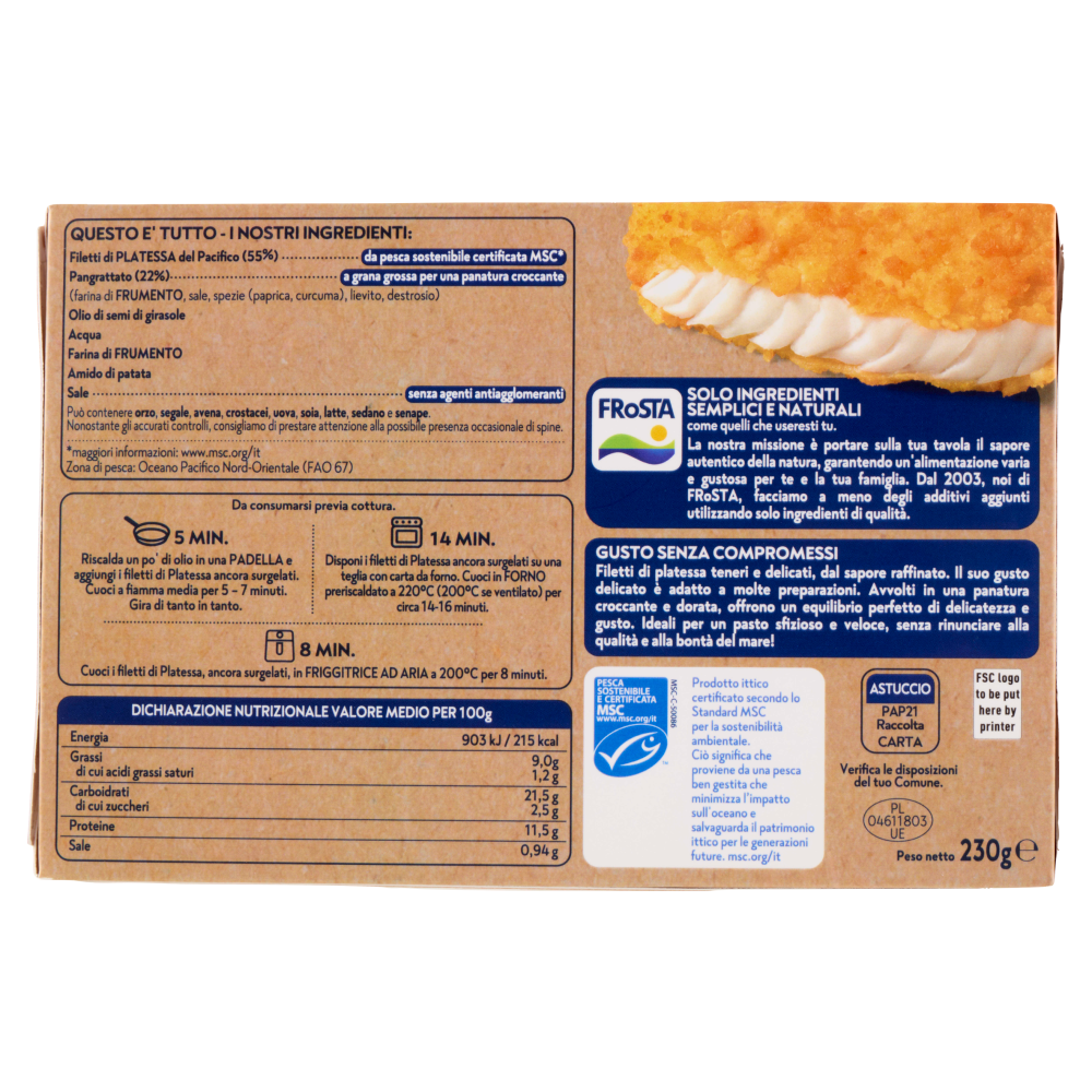 Questo e' tutto - I nostri ingredienti: Filetti di Platessa del Pacifico (55%) - da pesca sostenibile certificata MSC* Pangrattato (22%) - (farina di Frumento, sale, spezie (paprica, curcuma), lievito, destrosio) - a grana grossa per una panatura croccante Olio di semi di girasole Acqua Farina di Frumento Amido di patata Sale - senza agenti antiagglomeranti *maggiori informazioni: www.msc.org/it FRoSTA - Solo ingredienti semplici e naturali come quelli che useresti tu. La nostra missione è portare sulla tua tavola il sapore autentico della natura, garantendo un'alimentazione varia e gustosa per te e la tua famiglia. Dal 2003, noi di FRoSTA, facciamo a meno degli additivi aggiunti utilizzando solo ingredienti di qualità. Gusto senza compromessi Filetti di platessa teneri e delicati, dal sapore raffinato. Il suo gusto delicato è adatto a molte preparazioni. Avvolti in una panatura croccante e dorata, offrono un equilibrio perfetto di delicatezza e gusto. Ideali per un pasto sfizioso e veloce, senza rinunciare alla qualità e alla bontà del mare!