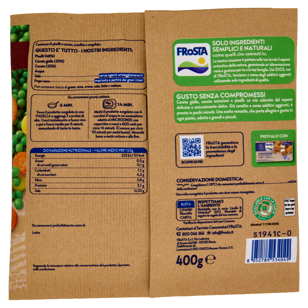 Questo è tutto - I nostri ingredienti: Piselli (48%) Carote gialle (25%) Carote (25%) Acqua Sale - senza agenti antiagglomeranti Pepe nero - macinato a partire dai grani interi FRoSTA - Solo Ingredienti Semplici e Naturali come quelli che useresti tu. La nostra missione è portare sulla tua tavola il sapore autentico della natura, garantendo un'alimentazione varia e gustosa per te e la tua famiglia. Dal 2003, noi di FRoSTA, facciamo a meno degli additivi aggiunti utilizzando solo ingredienti di qualità. Gusto senza compromessi Carote gialle, carote arancioni e piselli: un mix colorato dal sapore delicato e naturalmente dolce. Già condito e senza additivi aggiunti, è pronto in pochi minuti. Una scelta versatile, che porta allegria e gusto in ogni piatto, adatta a grandi e piccoli.