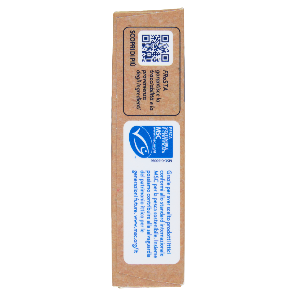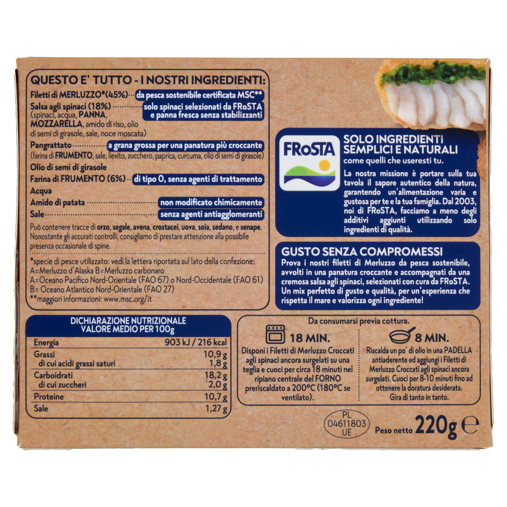 Questo è tutto - I nostri ingredienti: Filetti di Merluzzo* (45%) - da pesca sostenibile certificata MSC** Salsa agli spinaci (18%) (spinaci, acqua, Pannα, Mozzarella, amido di riso, olio di semi di girasole, sale, noce moscata) - solo spinaci selezionati da FRoSTA e panna fresca senza stabilizzanti Pangrattato (farina di Frumento, sale, lievito, zucchero, paprica, curcuma, olio di semi di girasole) - a grana grossa per una panatura più croccante Olio di semi di girasole Farina di Frumento (6%) - di tipo O, senza agenti di trattamento Acqua Amido di patata - non modificato chimicamente Sale - senza agenti antiagglomeranti *specie di pesce utilizzato: vedi la lettera riportata sul lato della confezione: A-Merluzzo d'Alaska B=Merluzzo carbonaro A-Oceano Pacifico Nord-Orientale (FAO 67) o Nord-Occidentale (FAO 61) B= Oceano Atlantico Nord-Orientale (FAO 27) **maggiori informazioni: www.msc.org/it FRoSTA - Solo Ingredienti Semplici e Naturali come quelli che useresti tu. La nostra missione è portare sulla tua tavola il sapore autentico della natura, garantendo un'alimentazione varia e gustosa per te e la tua famiglia. Dal 2003, noi di FRoSTA, facciamo a meno degli additivi aggiunti utilizzando solo ingredienti di qualità. Gusto senza compromessi Prova i nostri filetti di Merluzzo da pesca sostenibile, avvolti in una panatura croccante e accompagnati da una cremosa salsa agli spinaci, selezionati con cura da FRoSTA. Un mix perfetto di gusto e qualità, per un'esperienza che rispetta il mare e valorizza ogni ingrediente!