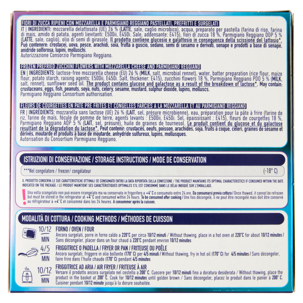 Senza glutineFiori di zucca ripieni con mozzarella e Parmigiano Reggiano pastellati, prefritti e surgelati