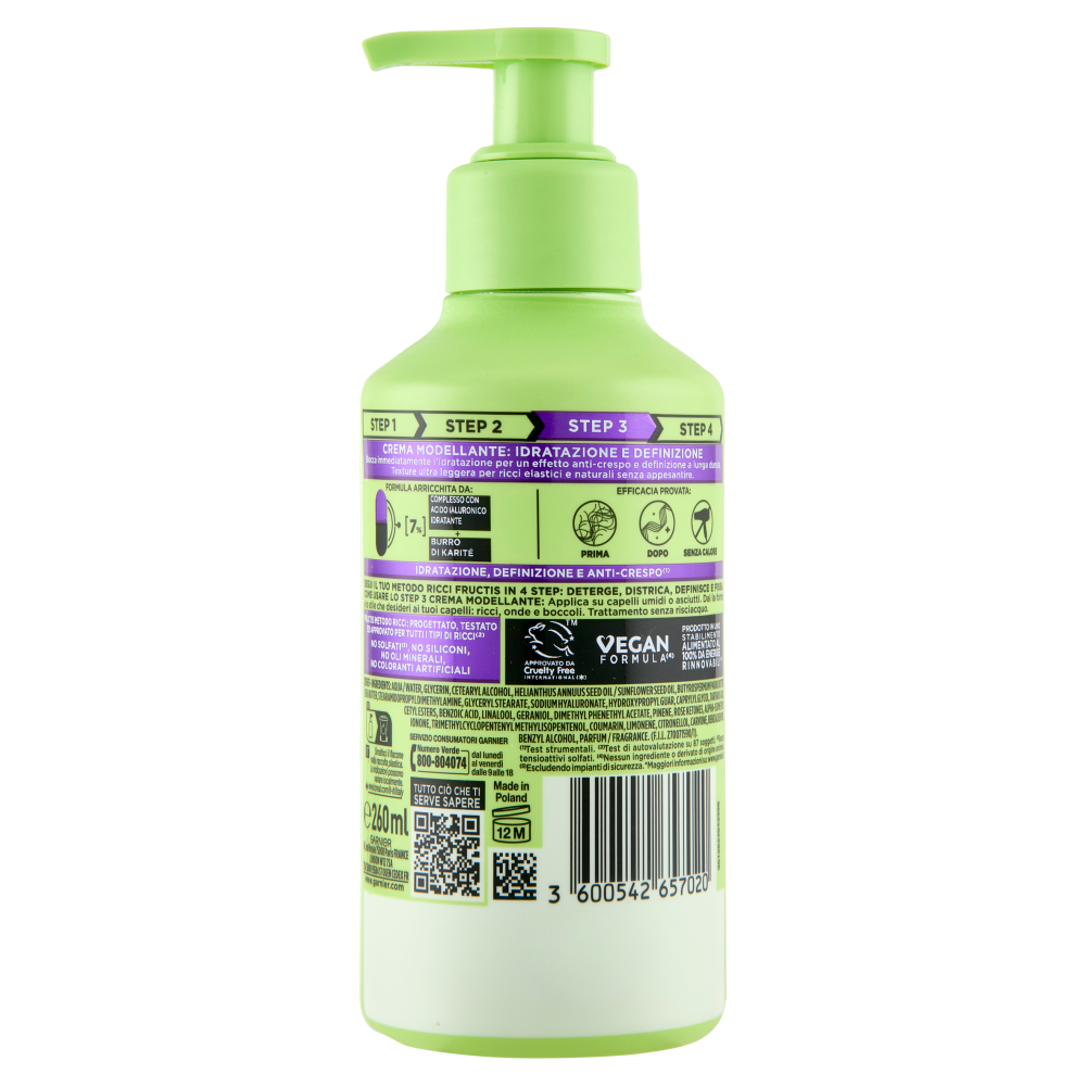 Crema modellante: idratazione e definizione Blocca immediatamente l'idratazione per un effetto anti-crespo e definizione a lunga durata Texture ultra leggera per ricci elastici e naturali senza appesantire. Formula arricchita da: [7%] Complesso con acido ialuronico idratante + Burro di karité | Efficacia provata: Prima - Dopo - Senza calore Idratazione, definizione e anti-crespo⁽¹⁾ Fructis metodo ricci: progettato, testato ed approvato per tutti i tipi di ricci⁽²⁾ No solfati⁽³⁾, no siliconi, no oli minerali, no coloranti artificiali Approvato da Cruelty Free International⁽*⁾ Vegan formula⁽⁴⁾ Prodotto in uno stabilimento alimentato al 100% da energie rinnovabili⁽⁵⁾ ⁽¹⁾ Test strumentali. ⁽²⁾ Test di autovalutazione su 87 soggetti. ⁽³⁾ Senza tensioattivi solfati ⁽⁴⁾ Nessun ingrediente o derivato di origine animale. ⁽⁵⁾ Escludendo impianti di sicurezza