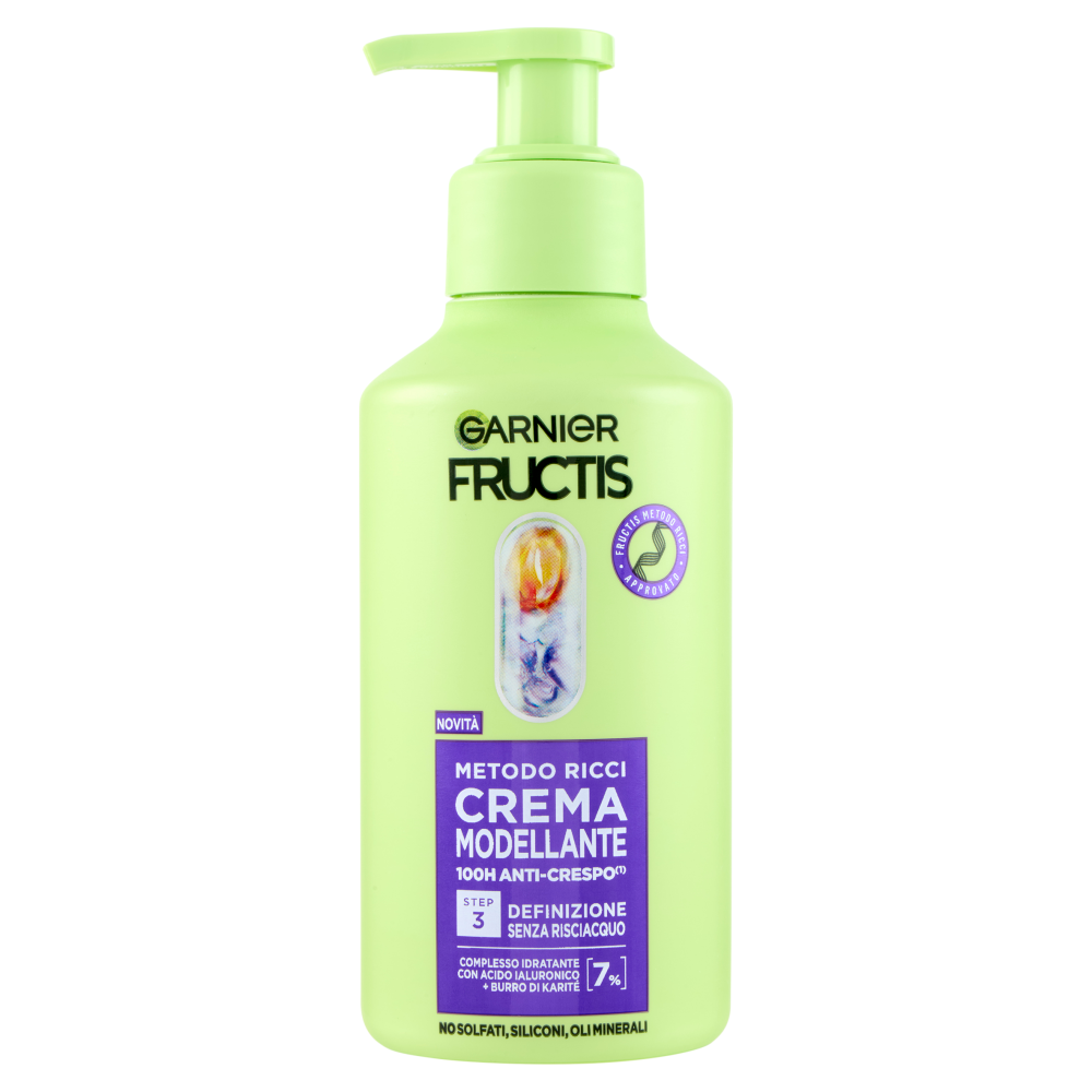 Crema modellante: idratazione e definizione Blocca immediatamente l'idratazione per un effetto anti-crespo e definizione a lunga durata. Texture ultra leggera per ricci elastici e naturali senza appesantire. Formula arricchita da: [7%] Complesso con acido ialuronico idratante + Burro di karité | Efficacia provata: Prima - Dopo - Senza calore Idratazione, definizione e anti-crespo⁽¹⁾ ⁽¹⁾ Test strumentali. Fructis metodo ricci: progettato, testato ed approvato per tutti i tipi di ricci⁽²⁾ No solfati⁽³⁾, no siliconi, no oli minerali, no coloranti artificiali ⁽²⁾ Test di autovalutazione su 87 soggetti. ⁽³⁾ Senza tensioattivi solfati