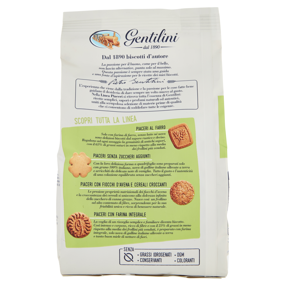 Gentilini dal 1890 Dal 1890 biscotti d'autore La passione per il buono, come per il bello, non lascia alternative, punta solo al massimo. Questa passione è sempre stata una guida e una fonte d'ispirazione per le ricette dei miei biscotti. Pietro Gentilini L'esperienza che viene dalla tradizione e la passione per le cose fatte bene guidano il desiderio di dare sempre un volto nuovo al gusto. Nella Linea Piaceri si ritrova tutta l'essenza di Gentilini: ricette semplici, sapori e profumi naturali ed autentici, uniti alla scrupolosa selezione di materie prime di qualità che ci consentono di soddisfare tutte le esigenze. Scopri tutta la linea Piaceri al farro Solo con farina di farro, senza latte né uova sono deliziosi biscotti dal sapore rustico e deciso. Regalano ad ogni assaggio la genuinità di antichi sapori, con il 65% di grassi saturi in meno rispetto alla media dei frollini più venduti. Piaceri senza zuccheri aggiunti Con la loro deliziosa forma a quadrifoglio sono preparati solo con grano 100% italiano, uova di galline italiane allevate a terra e arricchiti da delicate note di vaniglia. Tutto il gusto e l'autenticità di una colazione equilibrata senza zuccheri aggiunti. Piaceri con fiocchi d'avena e cereali croccanti Le preziose proprietà nutrizionali dei fiocchi d'avena e la croccantezza dei cereali si uniscono alla dolcezza infinita dello zucchero di canna grezzo. Nasce così un frollino ad alto contenuto di fibre, sorprendente per la sua friabilità unica e ricca di benessere naturale. Piaceri con farina integrale La voglia di un risveglio semplice e familiare diventa biscotto. Così intenso e corposo, ricco di fibre e con il 25% di grassi in meno rispetto alla media dei frollini più venduti, è preparato con farina integrale, solo uova di galline italiane allevate a terra e tanto buon miele di nettare di fiori.
