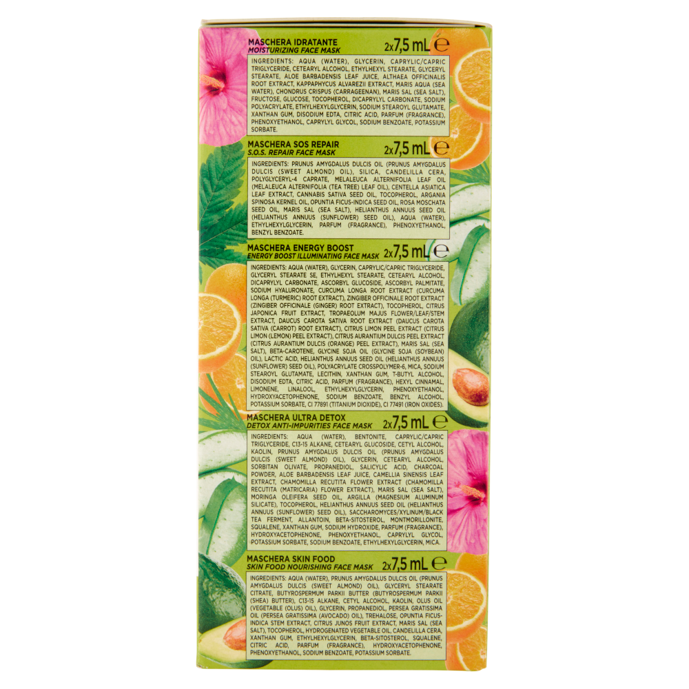 Maschera idratante Maschera SOS repair Maschera energy boost Maschera ultra detox Maschera skin food