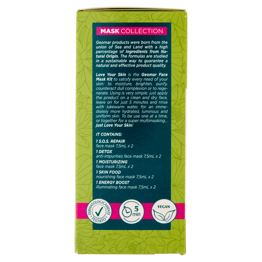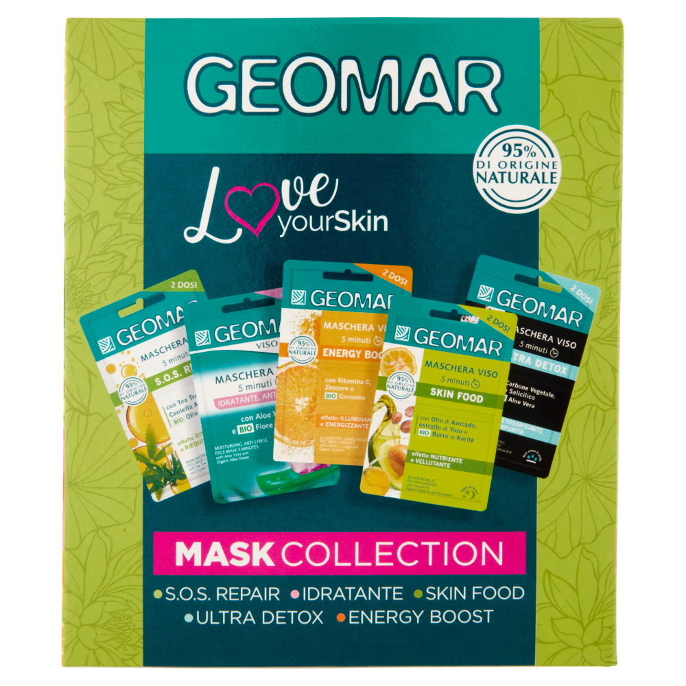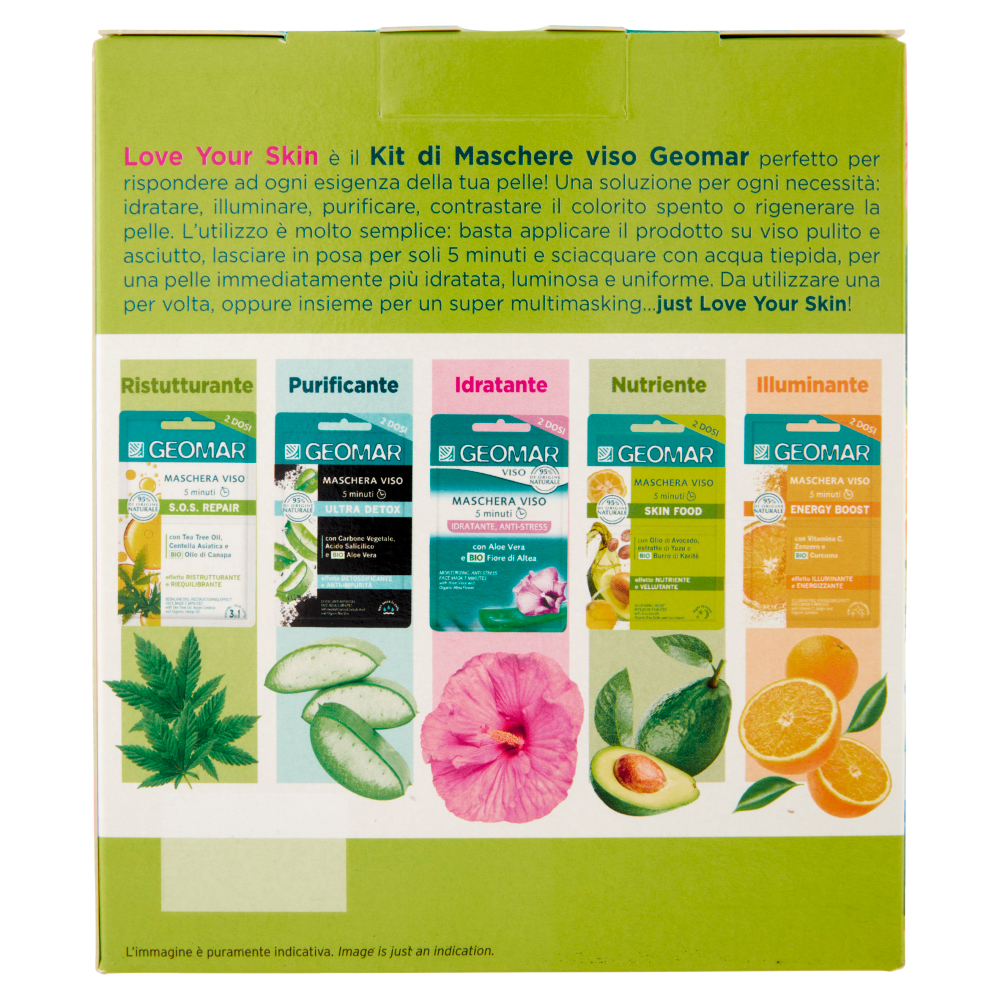 Love Your Skin è il Kit di Maschere viso Geomar perfetto per rispondere ad ogni esigenza della tua pelle! Una soluzione per ogni necessità: idratare, illuminare, purificare, contrastare il colorito spento o rigenerare la pelle. L'utilizzo è molto semplice: basta applicare il prodotto su viso pulito e asciutto, lasciare in posa per soli 5 minuti e sciacquare con acqua tiepida, per una pelle immediatamente più idratata, luminosa e uniforme. Da utilizzare una per volta, oppure insieme per un super multimasking... just Love Your Skin! Dermatologicamente Testato Tempo 5 min Vegan