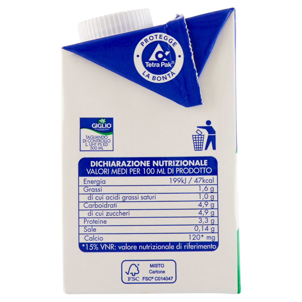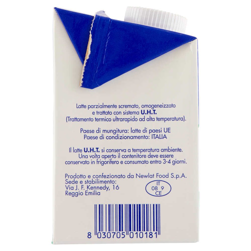Latte parzialmente scremato, omogeneizzato e trattato con sistema U.H.T. (Trattamento termico ultrarapido ad alta temperatura).