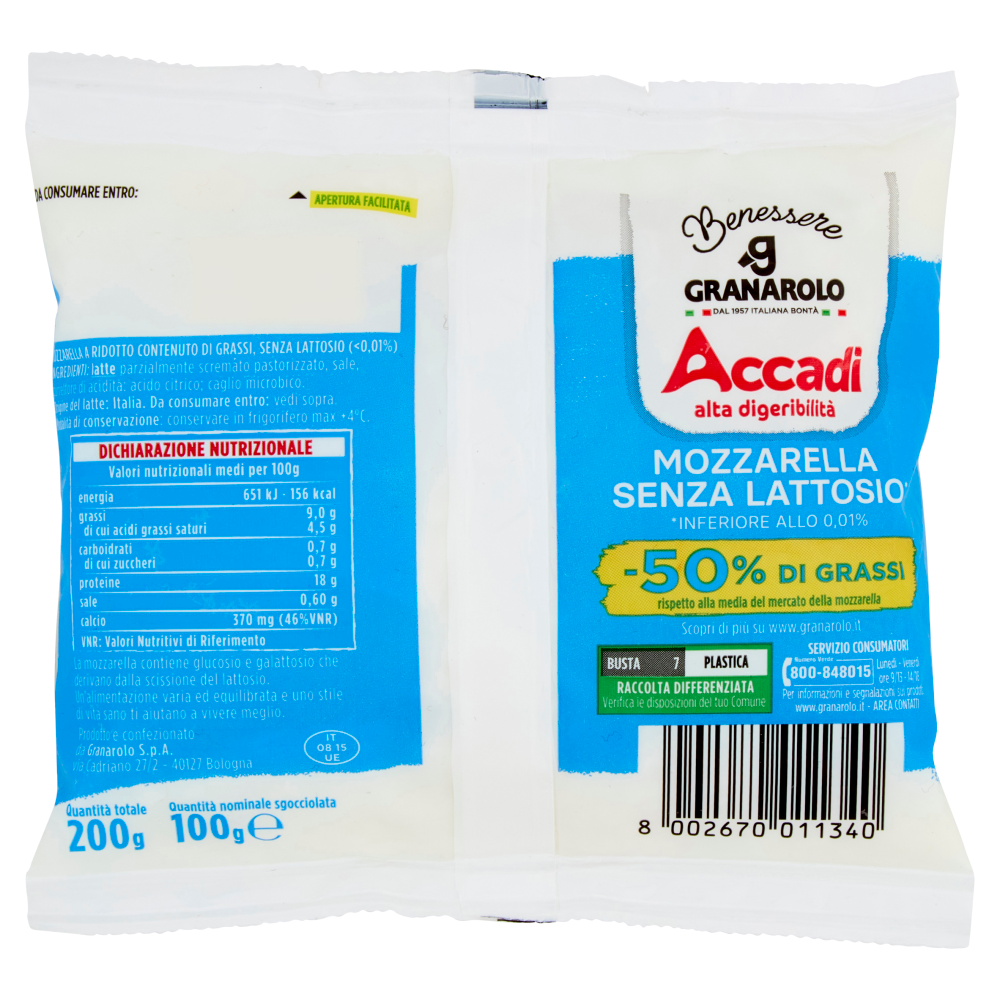 Granarolo Benessere Accadì Mozzarella Senza Lattosio* -50% di Grassi 100 g