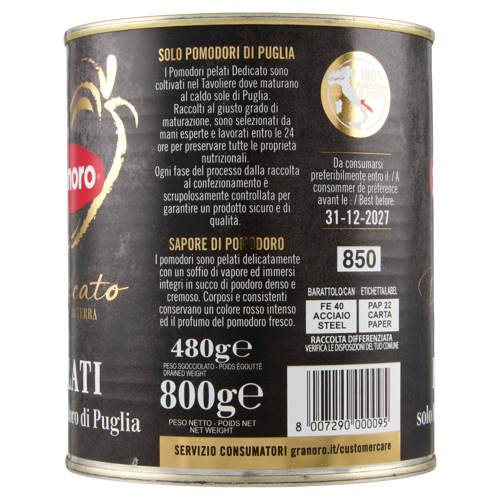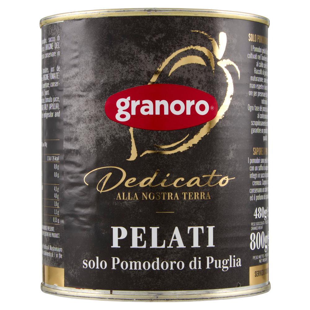 Solo pomodori di Puglia I Pomodori pelati Dedicato sono coltivati nel Tavoliere dove maturano al caldo sole di Puglia. Raccolti al giusto grado di maturazione, sono selezionati da mani esperte e lavorati entro le 24 ore per preservare tutte le proprietà nutrizionali. Ogni fase del processo dalla raccolta al confezionamento è scrupolosamente controllata per garantire un prodotto sicuro e di qualità. Sapore di Pomodoro I pomodori sono pelati delicatamente con un soffio di vapore ed immersi integri in succo di pomodoro denso e cremoso. Corposi e consistenti conservano un colore rosso intenso ed il profumo del pomodoro fresco. 100% Pomodoro di Puglia