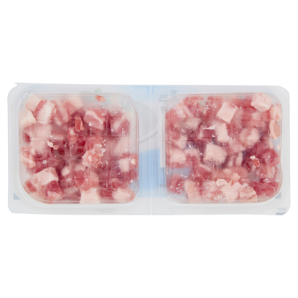 Da consumarsi previa cottura. Procedimento: scaldare una padella antiaderente, cuocere i cubetti di pancetta a fuoco vivace per 5 minuti girandoli spesso.