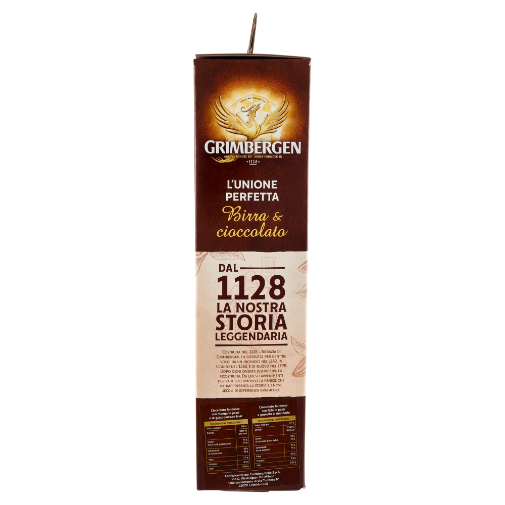 Assapora l'unione Perfetta con Vanini Blonde Rotonda & bilanciata Maltato 2½ su 5 Speziato 3 su 5 Fruttato 2½ su 5 Amaro 2 su 5 Corposa e bilanciata, Grimbergen Blonde si riconosce subito per il suo colore dorato e la densa schiuma ricca di delicate bollicine. All'olfatto, emergono intense note di ananas, chiodi di garofano, miele, liquirizia, malto affumicato e luppolo. Al gusto, questa birra sviluppa i sapori agrodolci tipici degli aromi di liquirizia, ananas, albicocca e susina. cioccolato fondente 62% con mango e passion fruit All'inizio della degustazione si assaporano le note fresche e dolci del mango, molto aromatico e dal sapore inconfondibile. Il passion fruit, caratterizzato da un profumo intenso ed un gusto morbido, si combina perfettamente con il cacao peruviano, donando un'esperienza sensoriale esotica e rinfrescante. Double Ambrée Corposa & maltata Maltato 4 su 5 Speziato 2 su 5 Fruttato 2 su 5 Amaro 2 su 5 Ricca e maltata, Grimbergen Double Ambrée si distingue per il suo colore ambrato, tendente al mogano e la densa schiuma avorio. All'olfatto, prevale inizialmente la fragranza del caramello, a cui seguono sentori di liquirizia con note di frutti rossi, prugne e malto tostato che donano un aroma complesso e coinvolgente. Questa birra ambrata sviluppa al gusto il suo carattere intenso con note agrodolci e accenni di caramello, prugne secche, malto e luppolo. cioccolato fondente 62% con fichi e mandorle In questa ricetta si uniscono perfettamente il fico, tipico frutto mediterraneo, con il suo gusto morbido e rotondo, e la granella di mandorle tostate, che con la sua croccantezza esalta la masticabilità della tavoletta, dando vita ad un prodotto molto gradevole ed equilibrato. L'unione perfetta Birra & cioccolato