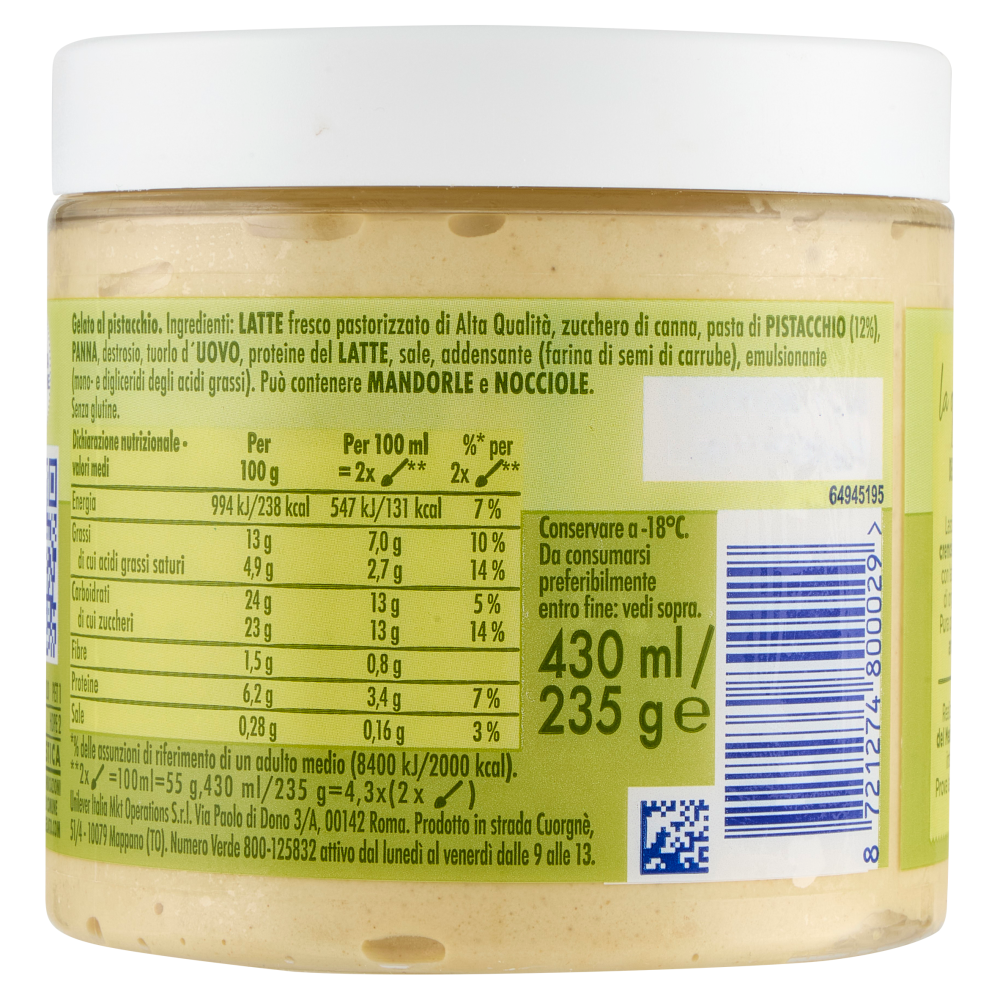 Origine Altro Testo Lasciati avvolgere dalla cremosità del nostro gelato, con latte e panna freschi e di origine 100% italiana | Realizzato con pistacchi del Mediterraneo