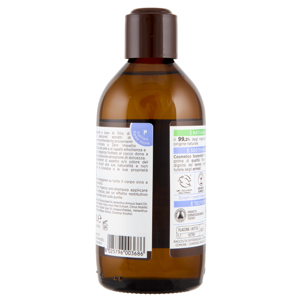 Sinergia vegetale a base di Olio di Cartamo e selezionati estratti di Melograno, Limone e Mandarino provenienti da filiera controllata a Zero Impatto Alimentare. Dona alla pelle e ai capelli emollienza e morbidezza. La fragranza fruttata al cocco dona a tutto il corpo una piacevole sensazione di dolcezza. È naturale perché Il 99,2% degli ingredienti è naturale o di origine naturale. È sostenibile perché Cosmetico Sostenibile ti garantisce: materie prime di qualità, filiera d'origine tracciata, dignità del lavoro, rispetto dell'ambiente e tutela degli animali. È testato perché Prodotto dermatologicamente testato Testato per i metalli pesanti: Ni, Cr, Co (< 0.0001%)