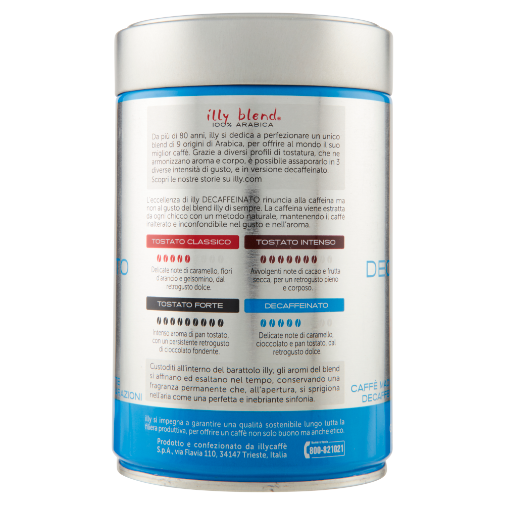 Da più di 80 anni, illy si dedica a perfezionare un unico blend di 9 origini di Arabica, per offrire al mondo il suo miglior caffè. Grazie a diversi profili di tostatura, che ne armonizzano aroma e corpo, è possibile assaporarlo in 3 diverse intensità di gusto, e in versione decaffeinato. Scopri le nostre storie su illy.com Tostato classico - Intensità 5 su 9 Delicate note di caramello, fiori d'arancio e gelsomino, dal retrogusto dolce. Tostato intenso - Intensità 7 su 9 Avvolgenti note di cacao e frutta secca, per un retrogusto pieno e corposo. Tostato forte - Intensità 9 su 9 Intenso aroma di pan tostato, con un persistente retrogusto di cioccolato fondente. Decaffeinato - Intensità 5 su 9 Delicate note di caramello, cioccolato e pan tostato, dal retrogusto dolce. Custoditi all'interno del barattolo illy, gli aromi del blend si affinano ed esaltano nel tempo, conservando una fragranza permanente che, all'apertura, si sprigiona nell'aria come una perfetta e inebriante sinfonia. illy si impegna a garantire una qualità sostenibile lungo tutta la filiera produttiva, per offrire un caffè non solo buono ma anche etico.
