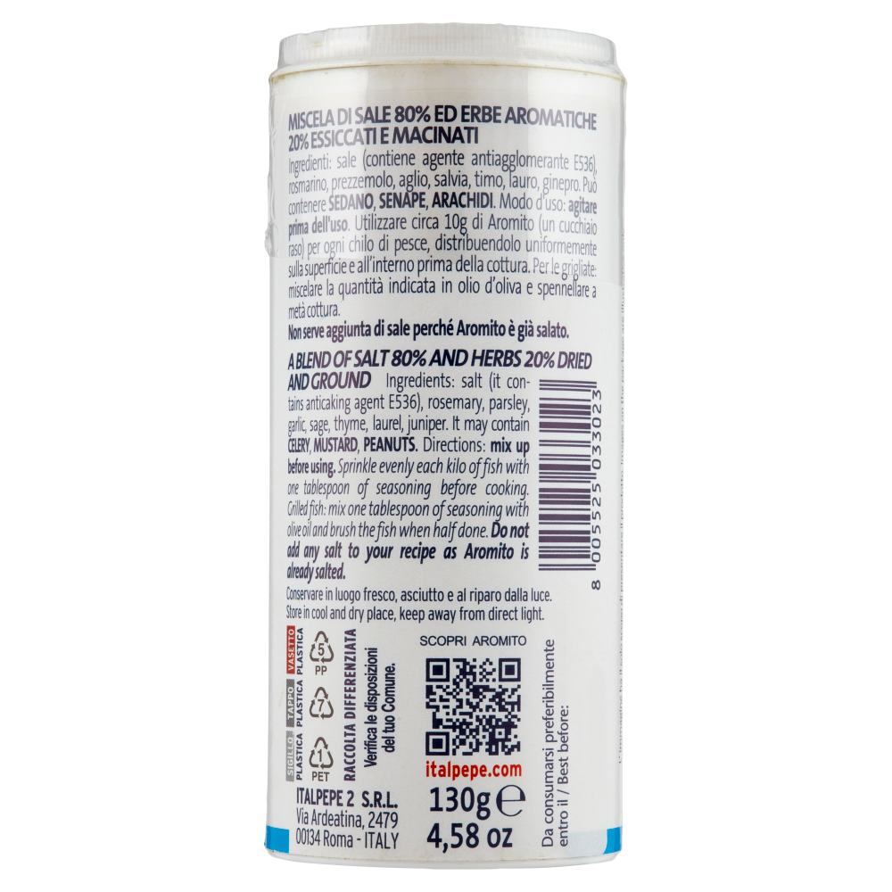 Modo d'uso: agitare prima dell'uso. Utilizzare circa 10g di Aromito (un cucchiaio raso) per ogni chilo di pesce, distribuendolo uniformemente sulla superficie e all'interno prima della cottura. Per le grigliate: miscelare la quantità indicata in olio d'oliva e spennellare a metà cottura. Non serve aggiunta di sale perché Aromito è già salato.
